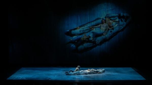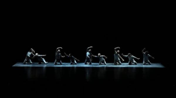 Dans Brise-lames ils sont finalement neuf (et on est sensible à la progression 3 -> 6 -> 9 de la distribution) à évoquer un état de corps proche de l’impesanteur subaquatique. Sous des lumières bleutées se déploie le tempo régulier et fluide de la mer, dans un grand calme et parfois un état proche de l’abandon. Tout semble respirer une harmonie parfaite et produire chez le spectateur un rare effet d’immersion hypnotique. Mais il y a le son amplifié de la respiration des danseurs qui se mue en étouffement, avant même qu’une caméra capte depuis le plafond l’image des neuf humains dans leurs costumes, apparemment mouillés, qui flirtent avec l’achromie.