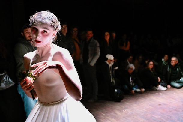 Bien que L’Épouse, de Rebecca Journo ne fasse pas partie de sa série d’autoportraits photographiques on pense aux clichés en noir et blanc d’une Francesca Woodman [notre critique]. Le clair-obscur dominant, la tenue de mariée de la danseuse-chorégraphe, d’une blancheur pouvant symboliser le deuil en Asie, l’expression dramatique de son visage opalin et la tonalité d’ensemble de la variation sont ceux d’une dame aux camélias ou d’un mannequin hoffmanien.