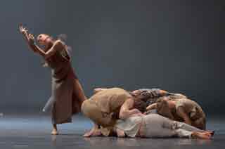 En deuxième partie, néanmoins, Le Sacre de Sasha Waltz, était presque plus classique dans sa gestuelle que l’œuvre de Nijinski. Citant abondamment Béjart (pour les sauts, les étreintes, et les grandes quatrièmes penchées), Pina Bausch (pour les déplacements de groupe, la terre sur le plateau et la robe donnée à l’Élue), elle en fait une sorte de saga New Age, avec son groupe, ses chefs de clan et ses enfants, pris dans un délire cataclysmique à venir. La version ne manque pourtant pas totalement de charme et réactualise la problématique du sacrifice, avec son côté mythique et sentimental… un peu trop convenu sans doute.