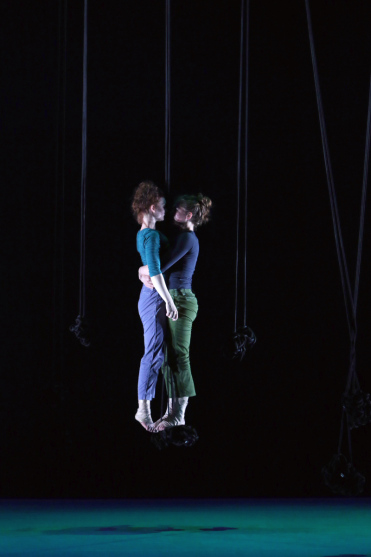 Kitsou Dubois : Absolument, on touche à l’onirique, d’autant plus que les interprètes ne grimpent pas sur des cordes de cirque mais sur des guindes de théâtre, ce qui nous permet de sortir de la symbolique du cirque. Ces guindes sont noires. Sur fond noir, elles peuvent donc permettre de créer l’illusion que les filles volent vraiment. C’est superbe.