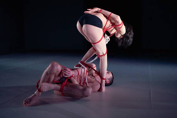 Autre de ces tableaux : un long duo d'intromission de doigts dans l'anus de l'autre. Connaît-on modèle plus binaire de la partition masculin-féminin, actif-passif, pénétration-réception, désespérément ordonnée en deux dimension ? Or la chorégraphie de (Nou) – et là c'en est joliment une – engage les deux partenaires dans une folie joyeuse de roulades, courses, bousculades, marches avant et arrière, feintes, ruses et galipettes (osons le mot) qui démultiplie cela en trois, en quatre, en une multitude effervescente de dimensions indisciplinées.