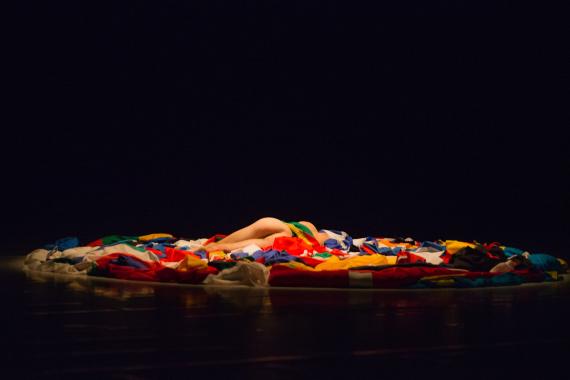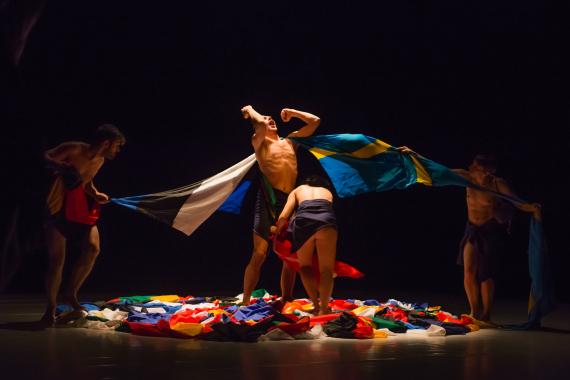 De même pour Christian Ubl dont nous nous étions fait en partie l'écho ici (http://dansercanalhistorique.com/2014/07/15/zoll-de-christian-ubl/) - (la partie visible lors du Concours [re]connaissance ayant été censurée lors de son passage à Avignon pour cause de nudité). Sans trop de surprise, nous avons donc été séduits par cet extrait de Shake it out, iconoclaste à souhait où le nationalisme ressortit à un folklore dépassé, tandis que les drapeaux flottent comme un vêtement aussi mal coupé qu’ajusté, sur le corps d’un des danseurs…