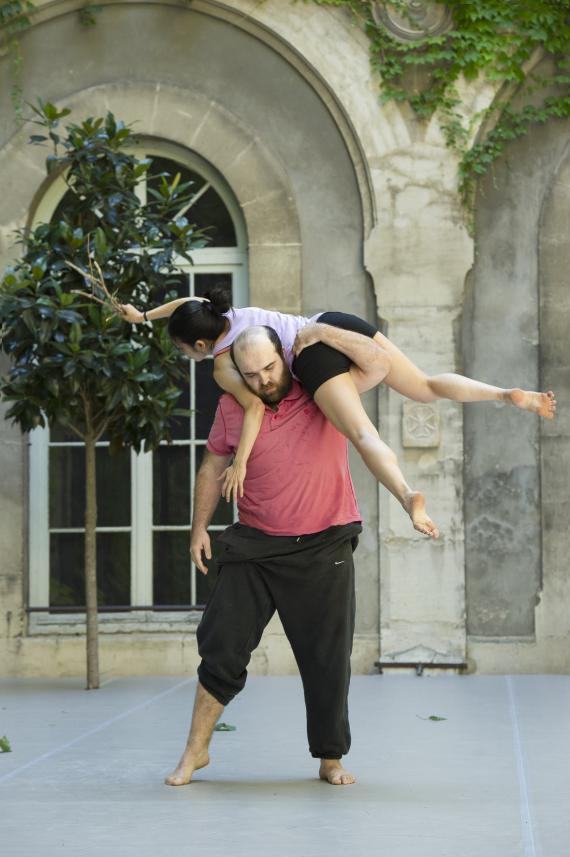 Un jour nous serons humains malgré le nombre d’intervenants inscrits au programme est très simple, Marik Renner dit le texte, Emmanuel Eggermont danse.