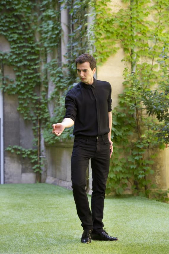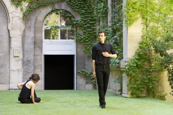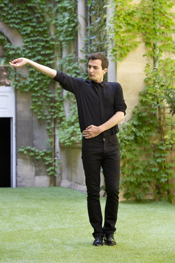 Un jour nous serons humains, part d’une phrase entendue dans un hôpital psychiatrique par David Léon. Cela donne lieu à un texte d’un seul tenant, très répétitif dans sa forme, dont l’éternel retour finit par constituer une sorte de partition verbale où affleure un appel à l’humanité, la considération des bêtes et des hommes tout comme la peur de disparaître. Même si ce texte est un peu laborieux car trop appliqué à copier un style « nouveau roman » (avec quelques décennies de retard), Marik Renner le dit simplement, sans trop d’effet théâtral, le laissant respirer et entendre, avec ses bruissements d’ailes et chant d’oiseaux en arrière fond. Emmanuel Eggermont apporte dans sa danse une sorte de présence absence, ses gestes esquissant des mouvements qui souvent se contredisent eux-mêmes, comme si le corps n’était pas unifié et certain mais une réunion de segments indépendants parfois antinomiques. Déployant cette gestuelle surprenante dans le Jardin qui semble presque trop petit pour ce grand corps dont les membres semblent occuper la majeure partie de l’espace, il produit une sorte de supplément au texte qui le complexifie, éloignant la frontière entre l’homme et l’animal par sa danse aux articulations inédites, posant la disparition et l’oubli dans sa façon de se mouvoir, découvrant d’une certaine manière la faille qui nous constitue.