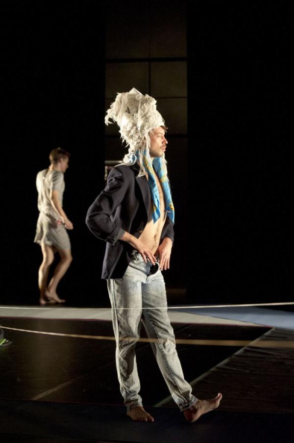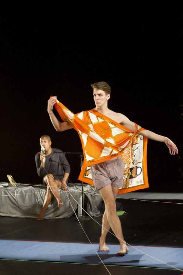 Ceci posé, la pièce en elle-même voit « grand » effectivement, dans une sorte de bazar savamment orchestré qui se moque de tout et d’abord de soi-même y compris dans sa dimension hyper hype et gay. La scénographie, signée Erik Flatmo, stylise vaguement catwalks et podiums dans un espace ouvert, gris et plutôt monotone. Au début, tout cela paraît très improbable. Après avoir lancé des danseurs à toute volée sur de faux podiums en front de scène, Trajal Harrell apparaît ensuite dans l’ombre, assis, dans une danse ondulante à souhait avant de se lancer dans un long dialogue avec Thibault Lac dont toutes les phrases commencent par « we are » pour égréner toutes les possibilités de paires ou d’appariements : Thelma and Louise, Pride and Prejudice (Orgueil et Préjugés), Dr Jekyll and Mr Hyde etc… oxymores et schizophrènes appréciés particulièrement. Avant d’incarner Ismène et Antigone.