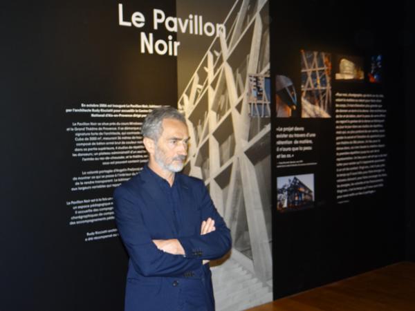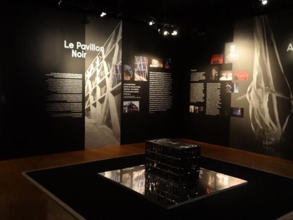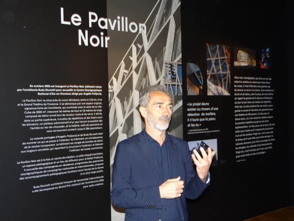 Dès l’entrée, une installation suspendue guide le visiteur. Elle n’est autre qu’une réplique du Pavillon Noir, bâtiment emblématique du Ballet Preljocaj dessiné par Rudy Ricciotti. De même, l’accès aux treize salles de l’exposition est signalé par une reproduction de la façade de cet édifice de verre et de fer, plongeant d’emblée notre visiteur dans les thèmes chers au chorégraphe : la verticalité, la ligne, le noir, la lumière.