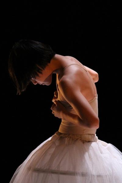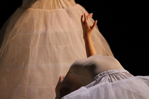 La chorégraphie se développe autour du costume porté, une jupe tutu, descendant jusqu’au pied à plusieurs jupons que les danseurs manipulent différemment en fonction des tableaux successifs. Cette jupe blanche couleur du deuil sert de voile protecteur, elle peut être soulevée ou froissée, elle induit la plupart des mouvements. Nous reconnaissons les variations délicates des bras et des mains de l’esthétique asiatique. Les regroupements des danseurs sont de toute beauté, avantageusement magnifiés par un travail de lumière sophistiqué. La pièce qui débute sagement se termine dans une folie organisée merveilleuse à voir.