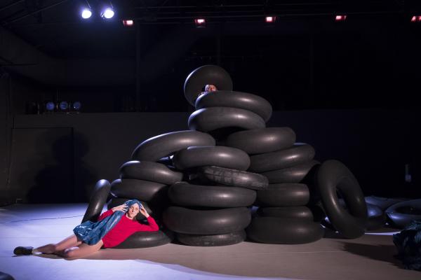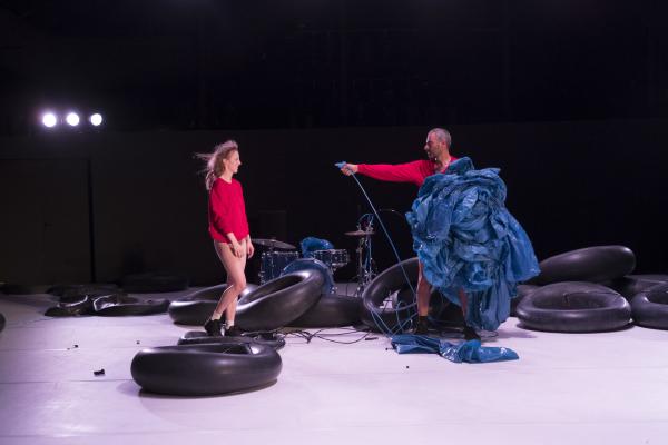 C'est de la science-fiction rustique, qui s'offre d'abord aux regards, de The Goldfish and the Inner Tube, une pièce de Ruth Childs et Stéphane Vecchione montrée en première en France par le festival June Events. Sur le plateau, d'abord vide de présence humaine, on distingue un paysage de matières informes, mais redressées en pics. Cela deviendra plus clair quand y débutera l'intervention humaine.
