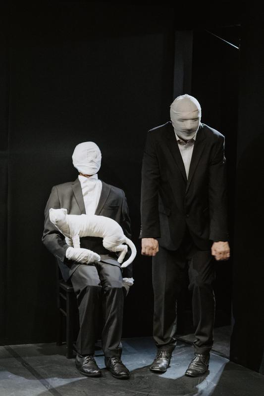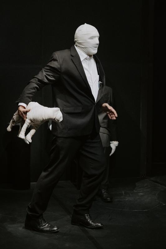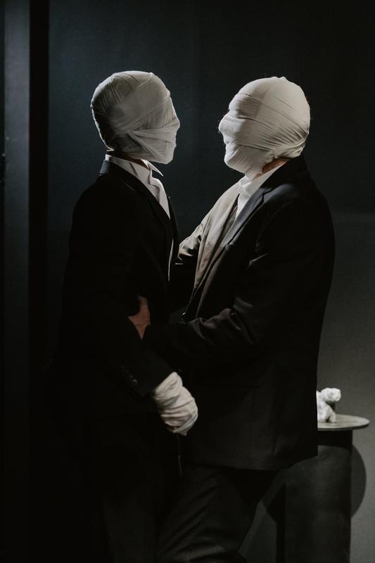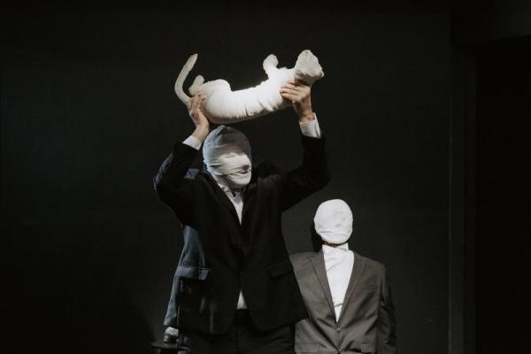 Pour le public, le parcours photographique se prolonge dans le minuscule théâtre, installé au milieu de la salle d’exposition. Et Nadj de reprendre des positions de corps à la fois debout et à quatre pattes, comme il installe son couple sur ses photos. Le visage drapé de blanc, il y rencontre son double, un quadrupède universel, un oiseau (le seul élément coloré) et, bien sûr, une grenouille. Dans un noir et blanc des plus stricts, Mnémosyne renoue avec les premiers éclats de l’univers nadjien, et notamment avec Canard Pékinois, sa pièce initiatique qu’il vient de reprendre dans une nouvelle version, intitulée Dark Union.