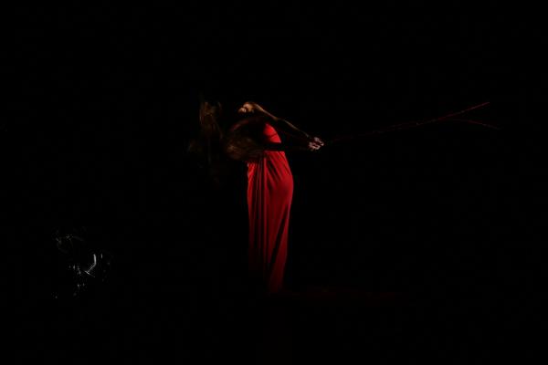 En se changeant à vue sur une muzak de relaxation au piano, la danseuse devient autre. De la prêtresse hiératique, voire de la déesse serpent de Knossos, elle se métamorphose en femme sans visage, la partie supérieure du corps étant dissimulée par un film de nylon doré ne cessant de frissonner suivant les caprices d’Eole, de brasiller suivant la lueur ambiante. On ne peut s’empêcher de penser à la variation grahamienne Lamentation (1943), les percussions de Mika Vainio s’étant substituées au piano de Louis Horst, le lamé ayant remplacé le jersey. Sauf que la gestuelle contemporaine n’a ici rien d’emphatique, rien d’expressionniste, rien de torturé.