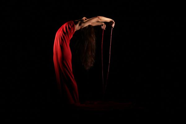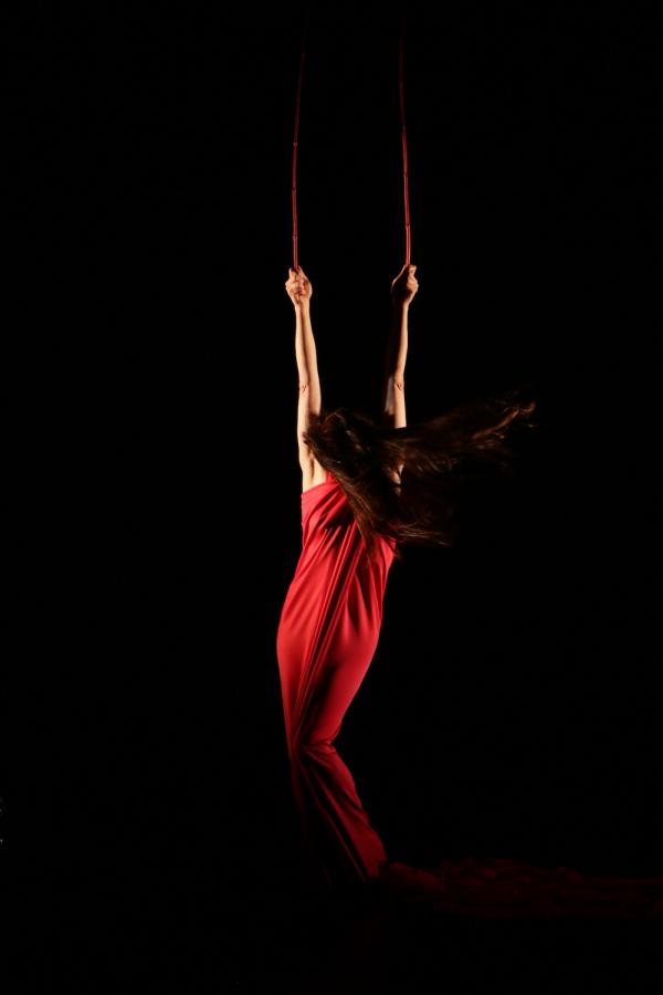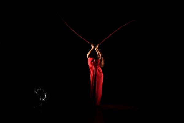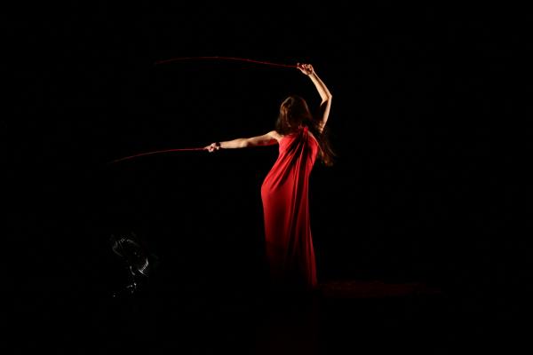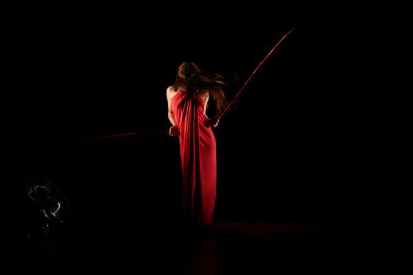 D’objet d’art cinétique qui étincelle, masquant tout fors les gambettes, la soliste en vient à incarner une figure féminine plus puissante, un bas-relief triomphant, érotique et guerrier à la fois. Elle joue à ce moment-là d’un carré de soie claire, large et ductile, comme d’une bannière mais aussi d’un rets destiné à capter le regard du spectateur après l’avoir, ce qu’il faut, affriandé. L’élémentarité de la danse est soulignée par la musique répétitive du groupe techno allemand Recondite.