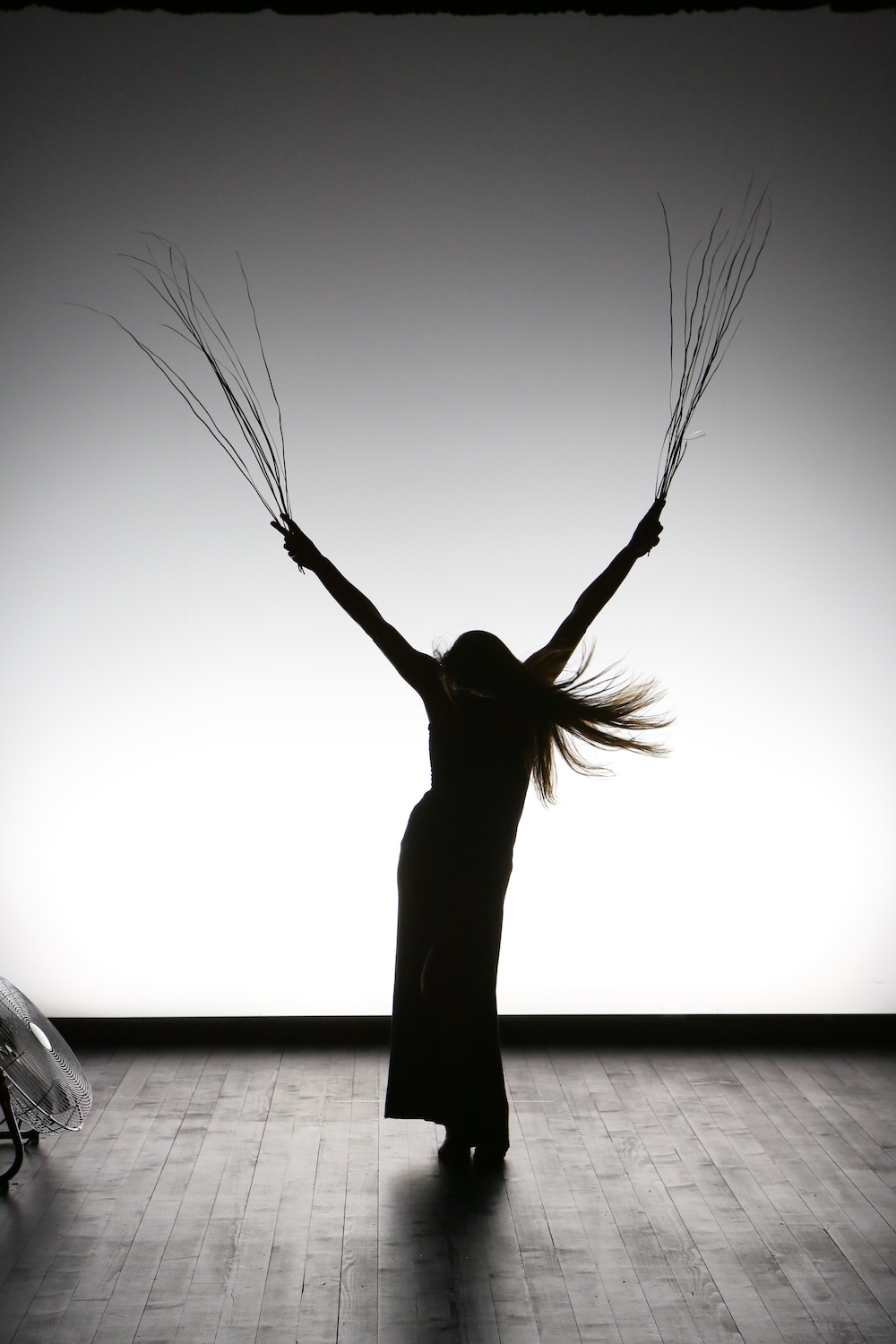 Le premier tableau, car c’en est un, tant la danseuse affectionne le surplace, la quasi-immobilité – celles des membres inférieurs en particulier –, la lenteur, se déroule sur une belle composition électronique de Ryoji Ikeda. Vêtue d’un justaucorps et d’une longue jupe noirs, pieds nus, Anne Perbal exécute une série d’amples et extrêmement souples mouvements de bras tenant entre ses mains un bouquet de hautes herbes. Les gestes sont bissés ad lib, sur un tempo languide qui contraste avec le vivace nettement plus entraînant de la musique. Tout du corps et de l’accessoire vibre et ondule au gré du souffle du ventilo posé à quelques pieds côté jardin.