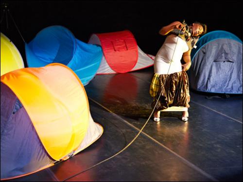 La véritable star est ici le costume, réversible et extensible à souhait. Ce labyrinthe change de forme, de couleurs et d’univers sans qu’il soit nécessaire d’enlever une seule pièce. L’ingénierie se double d’ingéniosité. Les tentes finissent sur le plateau, voir sur le corps d’Elisabeth. Au gré des transformations, Tambwe devient Eve, danseuse de revue ou chanteuse de soul ou de blues. Mais Colette Magny ou autres ne passent qu’en play-back, et c’est dommage. Robyn Orlin n’a-t-elle pas déjà travaillé avec des chanteuses hors pair? Enfin, quand les tentes deviennent accessoires et même costumes, on ne peut s’empêcher de penser à un spectacle autrement plus dramatique, Letters from tentland d’Helena Waldmann, qui explore la situation de la femme en islam, créé à Téhéran. Car « tchador » signifie « tente ». Dans ce monde-là il faut des couilles, en effet, pour être une femme. La tente, une symbolique à tiroirs…