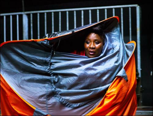 CQFD. Car on y évoque l’expulsion du paradis et la chute de l’ange! Excusez du peu, semble vouloir dire Robyn Orlin. Ses « réflexions sur la chute » débutent par une drôle d’invasion de chenilles, ce qui a de quoi agacer Adam et Eve. Mais ici le duo n’en est plus un, car au lieu de s’envoyer en l’air, ils se succèdent dans deux solos. C’est plutôt à l’intérieur de l’une et de l’autre que se croisent tant et tant de personnages et de mythes…Et pourtant, le premier tableau est la seule vraie surprise. Quelle scène bucolique et anarchique en même temps! Une cinquantaine de spectateurs, voire plus, sont assis sur le plateau. Les oiseaux chantent. Et les sièges des premiers rangs sont couverts de tentes de camping. Celles-ci évoquent autant les vacances que les sans-abris. Aussi, beaucoup de spectateurs se méfient d’une telle intrusion et n’osent pas s’asseoir devant, par peur de ne pas voir le spectacle. Là-dessus arrive Elisabeth Bakambamba Tambwe en Eve noire. Mais avant de commencer, il faut rétablir l’ordre sur le plateau! Femme de ménage et soliste à la fois, elle va donc virer tout ce jardin d’Eden, non sans pester contre sa patronne chorégraphe.
