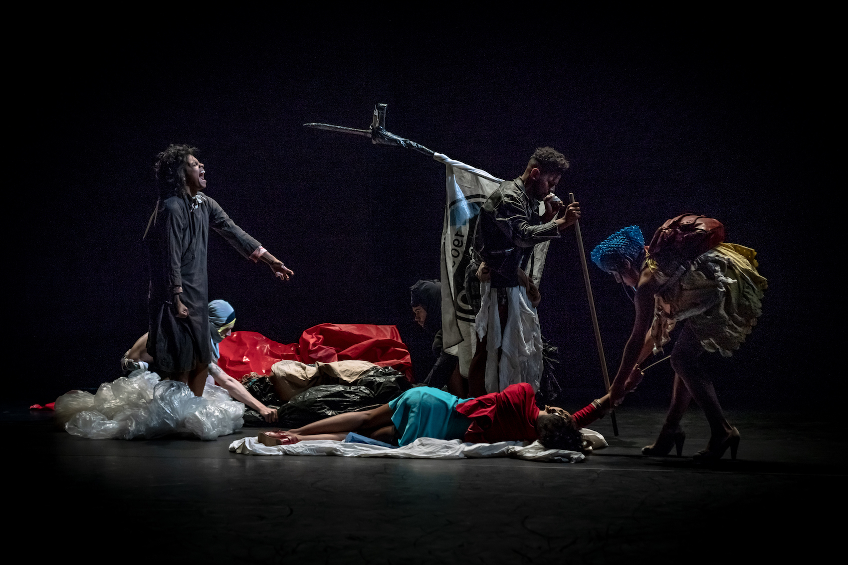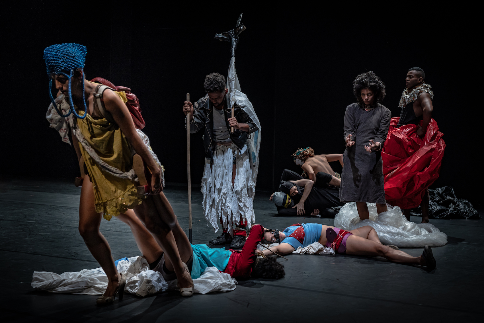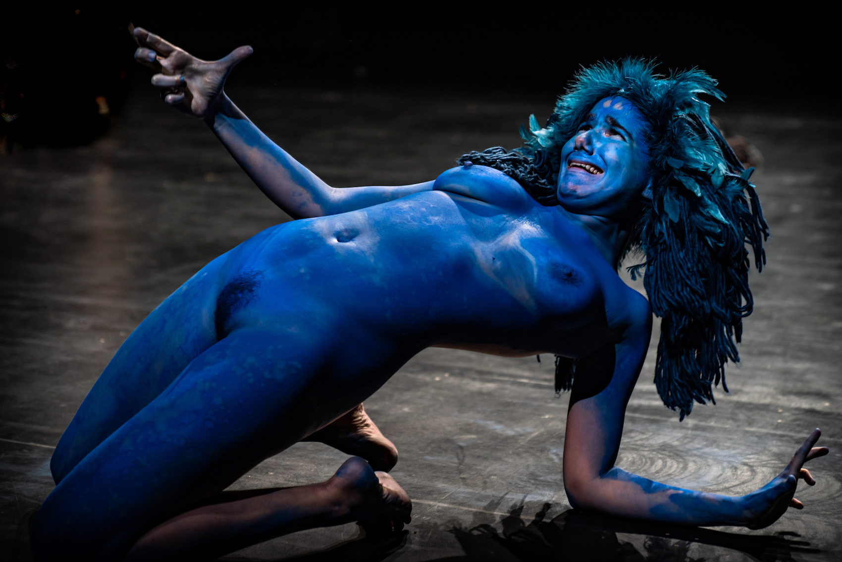 Au-delà de cette filiation avec l’univers de Marin, le petit peuple de Fúria entame un voyage dans l’histoire de la peinture, avec le pathos de La Liberté guidant le peuple, la frénésie suggérée dans le Jardin des Délices ou des images circassiennes qui peuvent renvoyer à Fernand Léger. De toute façon, ces pyramides, ces corps plus ou moins nus, ces effondrements spontanés de certains ou de tous sont largement ouverts aux associations et aux bonnes volontés des amateurs d’art de tous poils. Nous serions ici comme dans une fureur guidant le peuple, comme dans un enfer dantesque où les suppliciés auraient décidé d’utiliser leurs derniers chiffons pour se lancer dans un carnaval brésilien, jusqu’à couvrir les corps ou le sol de peinture ou d’autres surprises qu’un Rodrigo Garcia ou une Angelica Liddell ne renieraient pas, et d’autres qui peuvent nous renvoyer à la danse expressionniste et notamment à Mary Wigman. Il y a là une Furie par excellence, transfigurée par la peinture bleue couvrant son corps et ses cheveux. Il y a des cadavres qu’on déplace en tirant des bâches, et des tours de piste sur le dos de danseurs à quatre pattes.