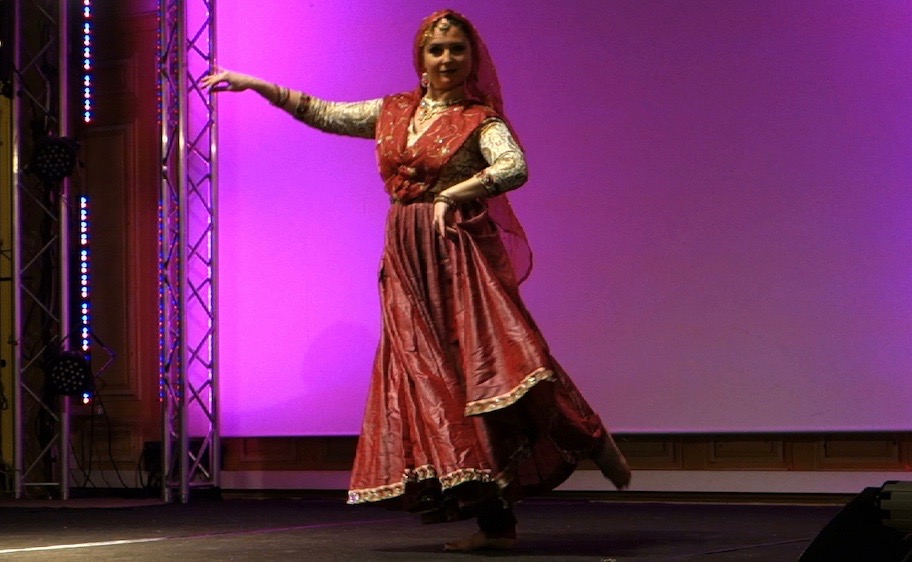 Isabelle Anna, vêtue d’une robe somptueuse couleur églantine, la tête coiffée d’un voile de soie de la même teinte, les pieds nus, des crotales métalliques fixés aux chevilles, fait montre de son talent, qui est immense, en interprétant Les Trois courtisanes, une danse de style khatak, sur un air traditionnel de l’Inde du nord. La musique, enregistrée, présente des accents arabisants – l’inverse étant vraisemblable, les traditions orientales ayant aussi leurs racines du côté de l’Inde.