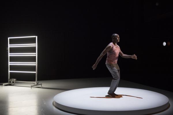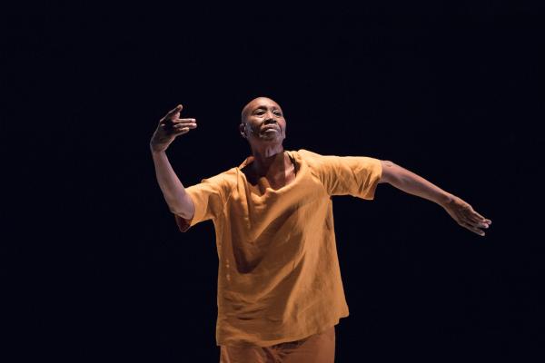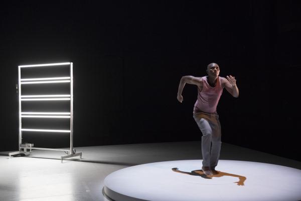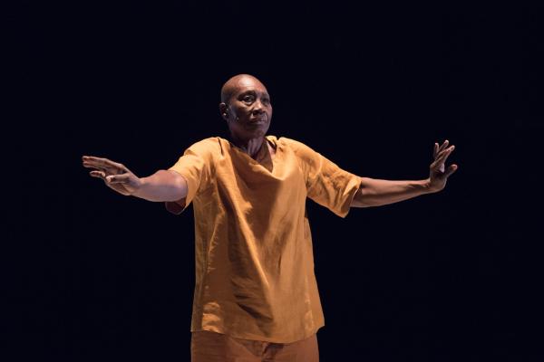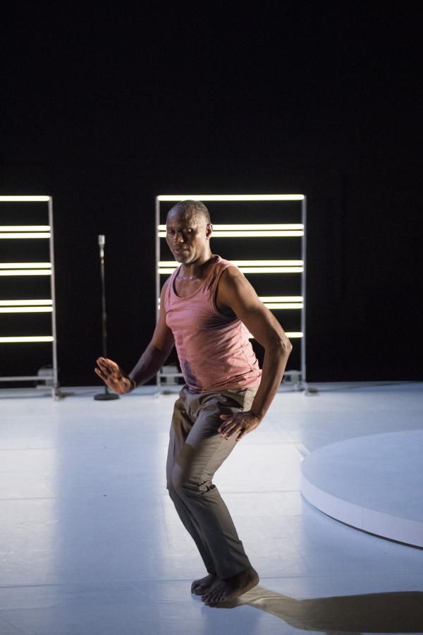 Représenté dans le cadre accueillant de la Cour minérale d’Avignon Université, Multiple-s faisait donc se succéder, avant un court final dansé en commun, trois duos de Salia avec des personnalités artistiques venant d’horizons différents : la danseuse et chorégraphe Germaine Acogny, l’écrivaine Nancy Huston, et le compositeur Babx auteur par ailleurs des musiques des trois pièces. Chaque protagoniste s’exprimait d’abord seul, par la danse, les mots ou la musique, puis accompagné en parallèle par la danse de Salia avant d’entrer en dialogue gestuel avec lui sur un plateau tournant circulaire posé à droite de la scène. Le projet ayant été entamé il y a deux ans, chaque opus a déjà été créé séparément au cours des derniers mois. Mais c’était la première fois qu’ils étaient montrés tous trois ensemble, dans la tiédeur de la nuit avignonnaise.