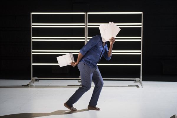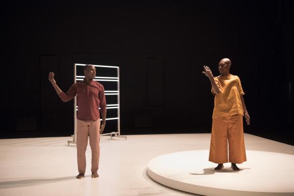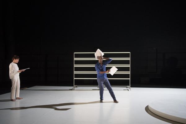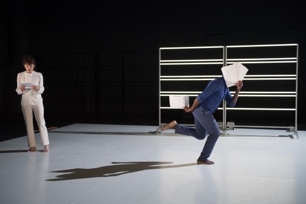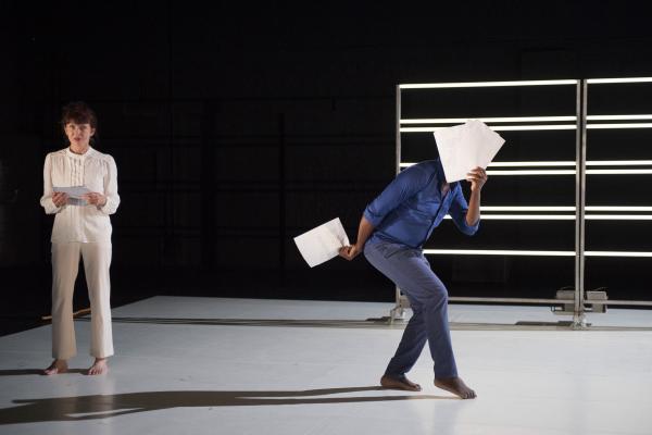 D’abord seule, la romancière et essayiste lisait les feuillets, jetés au fur et à mesure sur le sol, des extraits de trois de ses livres : Limbes, Limbo, un hommage à Samuel Beckett (déjà utilisé par le chorégraphe dans sa pièce Désirs d’Horizons), Nord Perdu et In Deo. Bientôt Salia, cette fois tout en bleu, entreprenait autour d’elle un solo devenant duo à deux voix et à deux corps, dans lequel la Canadienne vivant en France s’interrogeait sur l’exil, tandis que le danseur burkinabé faisait entendre haut et fort les mots de sa langue maternelle.