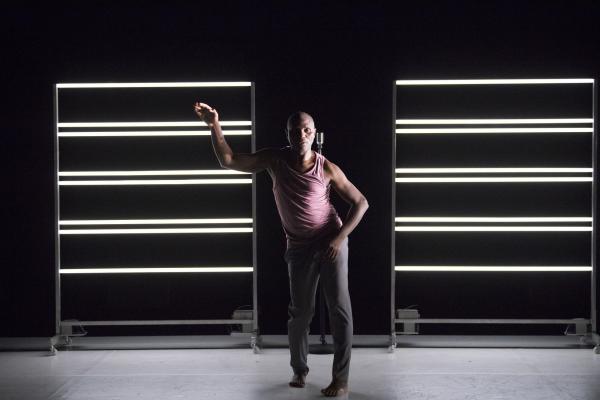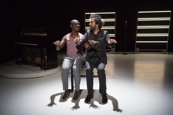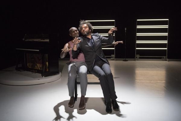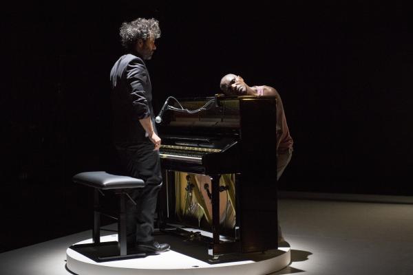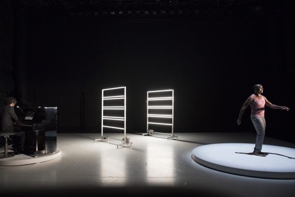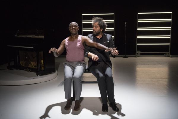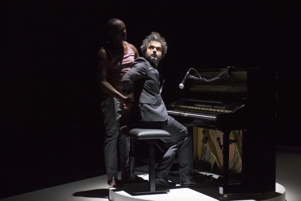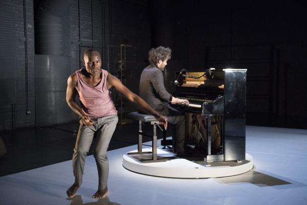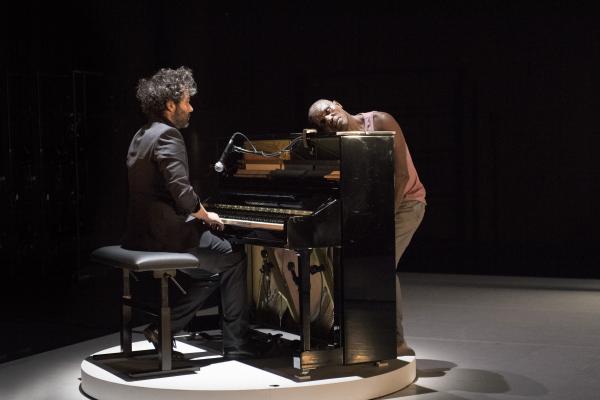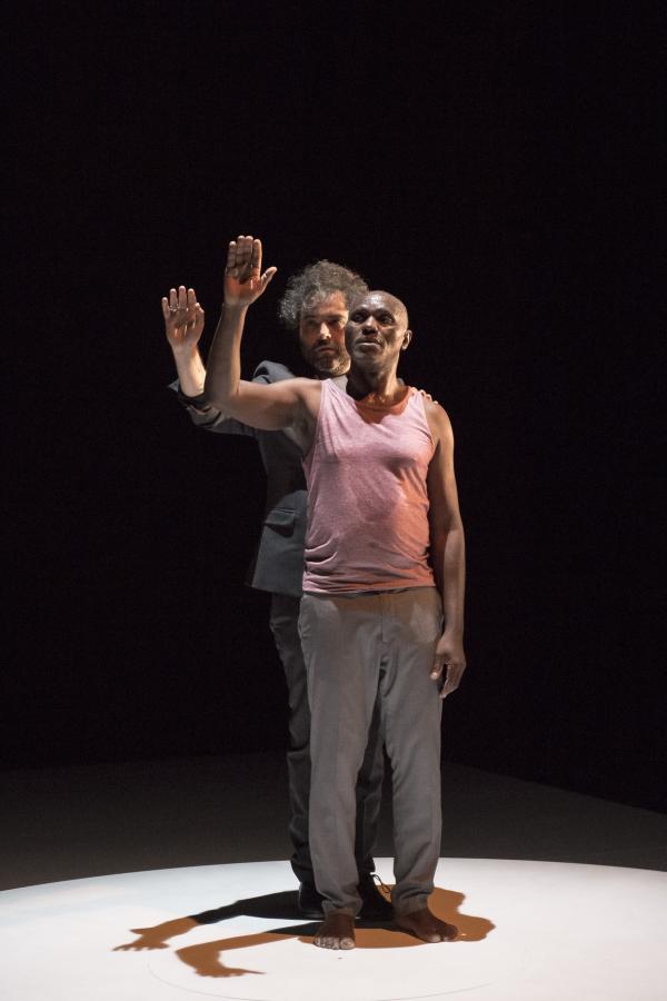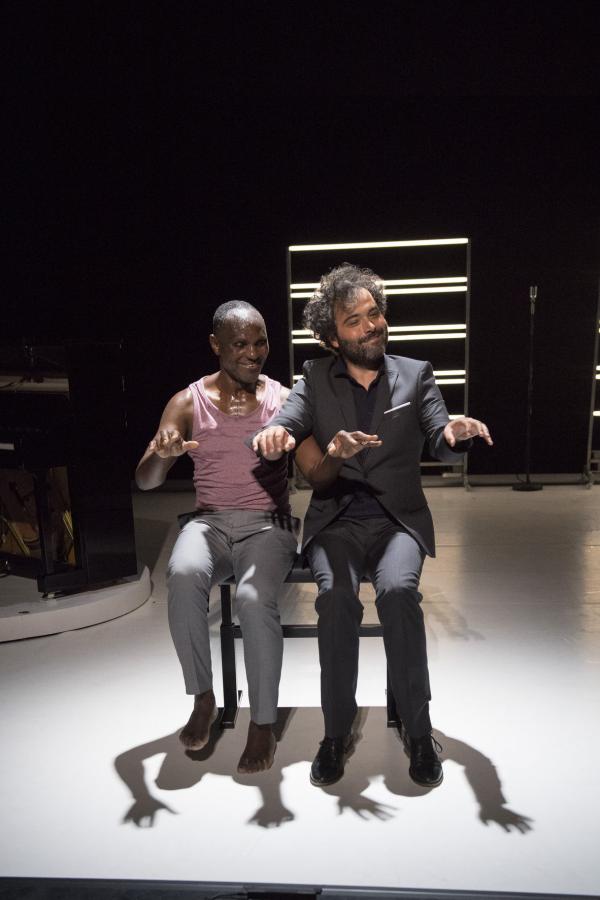 Leur succédait Babx, dont l’arrivée était précédée de celle d’un piano noir. Assis devant l’instrument, il se mettait à jouer tout en chantant les vers d’un poème d’Aimé Césaire. Entré sur scène dans un ensemble rose et gris, Salia Sanou en reprenait avec lui le refrain. Ici, le face-à face se faisait plus doux, en harmonie avec la musique du compositeur qui « a le don de rendre plus flottant ».