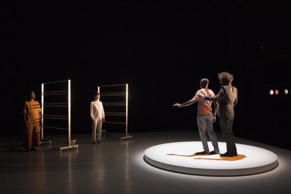 Tous deux « cassés en deux » et ayant « donc une histoire », selon l’expression de Nancy Huston, ils s’affrontaient dans une joute oratoire et gestuelle aiguisée pour finalement se rejoindre, saisis de tremblements, sur le socle tournant.