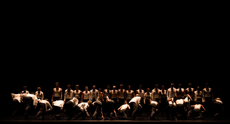 La première partie, part d’un récit très court, des indications scéniques que Pite avait écrites pour une autre pièce et qui sont finalement à l’origine de Body and Soul. Ce texte aux accents vaguement beckettiens façon Dramaticules mais en beaucoup trop démonstratif, dit par Marina Hands, est traité comme une phrase musicale qui va servir de point de départ à toute la partition chorégraphique. Celle-ci met en tension le duo, de deux individus, deux groupes, deux êtres, en opposition ou en communion, comme « le corps et l’âme ». A partir de là, Crystal Pite reprend, adapté à cette figure duelle, des modèles de composition éprouvés dans Seasons’ Canon, mais aussi dans In the Event créé pour le NDT 1 et vu à Chaillot la même année, d’ailleurs sur la musique du même Owen Belton. Ce sont des unissons parfaitement réglés qui se déploient en réactions en chaîne, en cascades, en éventails, en houle, effets dominos, etc. Les duos et les mouvements de groupe alternent de façon rigoureuse, et un peu répétitive, comme le feraient solistes et chœurs. La gestuelle a des fulgurances formidables, avec ses torsions, son organicité, ses convulsions et ses extensions de bras, de jambes, ses affaissements.