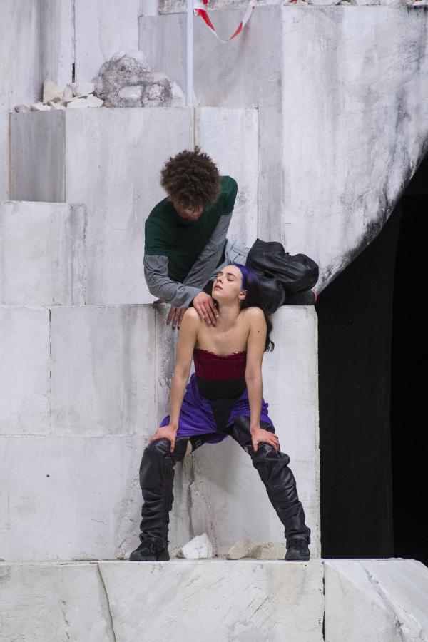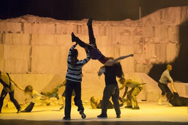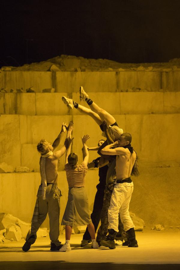 Room with a View a tout d’une évolution, comme si cette création découlait directement de la précédente. L’esprit du club techno de Tbilissi, le Bassiani, avec son opposition à la politique du gouvernement géorgien s’y prolonge, tout comme la vision d’une pierre chargée d’histoire. Dans le paysage improbable d’une carrière industrielle, un DJ emmène une bande de jeunes dans ses envolées et les teufeurs le lui rendent bien. La scène est dans les bas-fonds d’un monde probablement dystopique où une vingtaine de jeunes laissent éclater leur énergie, leurs pulsions et leurs rêves. Un bloc de pierre haut de dix mètres, des gravats, eux aussi de volumes impressionnants. Où l’on se croit sous un pont d’autoroute effondré ou dans les ruines du stade de football de Tbilisi, là où se trouve le club Bassiani.
