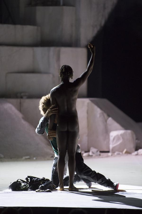 Et les regards se tournent vers le ciel, vers ce plafond de la salle qui commence à clignoter à nouveau, comme pour indiquer une voie de sortie spirituelle. Suite à quoi tous disparaissent en escaladant la pierre, comme s’ils se mettaient à voler. Room with a View: On peut se trouver confiné à des moments, mais il faut continuer à cultiver les visions. Et voilà que juste deux semaines après sa création, le monde n’est plus le même. Avec l’effondrement progressif des certitudes de la veille, on constate qu’il s’agit là d’une pièce au potentiel parfaitement visionnaire. Emmanuel Macron nous parle d’une « guerre sanitaire » ?