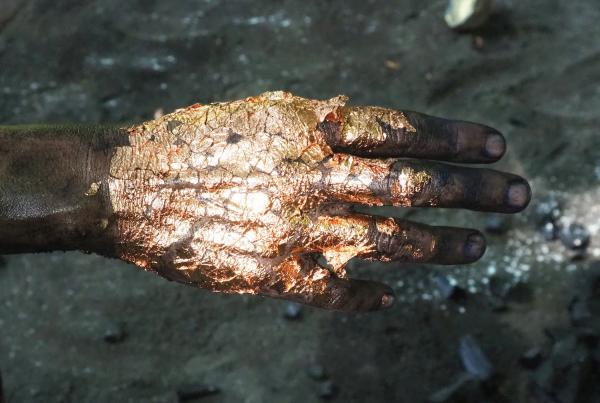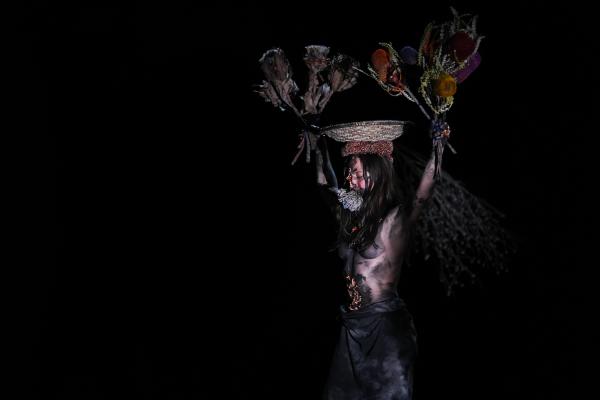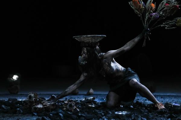 Seule survivante sur ce tas si sombre qui émet des sons de vibrations propres au feu qui émane du centre de la terre, la jeune femme dont le corps est recouvert du noir charbonneux ne cesse de ramper et de toucher, sentir, palper chaque pierre et chaque bout de matière qui lui permettrait de survivre. Comme si elle revenait à la préhistoire, elle démontre que la nature, même totalement détruite, possède des trésors cachés dont on peut tirer parti comme le font toujours aujourd’hui certaines tribus. Le charbon, les pierres, le feu, l’eau, le bois, un bout de tissu et de miroir, tout est source de vie.