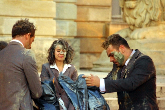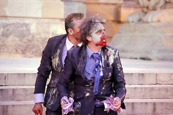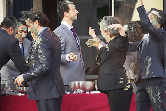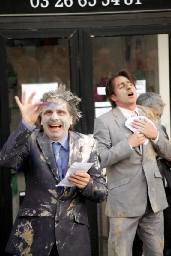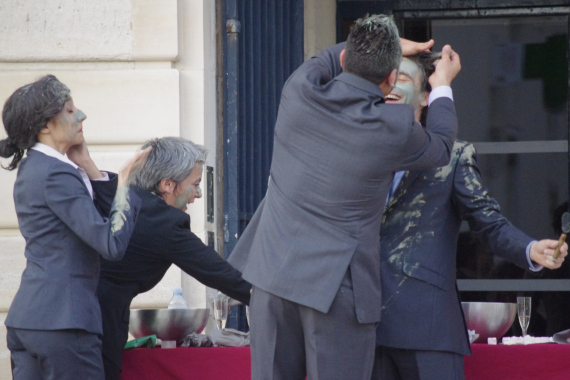 Quelques friandises en mousse plus tard,les masques tombent. La sauvagerie si savamment dissimulée saute à la figure des uns et des autres sous forme de jets de peinture. Chacun s’éclate en imbibant les costumes, les visages et les cheveux de ses pairs. Du jeu enfantin naissent des monstres féroces. Tout ce panthéon se rue maintenant sur le public, comme pour déchirer les spectateurs, les uns après les autres.