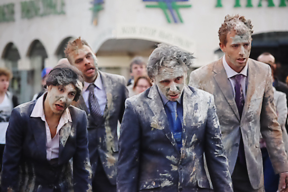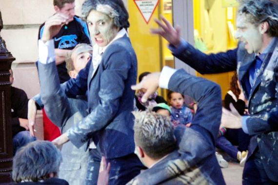 À même le bitume, féroces, ils se frottent aux pavés. Mais ils ne pensent qu’à ça : l’argent ! Et quand l’un d’entre eux perd son I-Phone, c’est le drame! Ils courent, ils s’arrêtent, ils se battent. Et finissent ensanglantés, mais trouvent toujours quelque part des billets de 500 € pour s’en mettre plein les poches. Le message est un peu simpliste. Sur quoi nous a-t-on ouvert les yeux que nous ne savions déjà? Reste que leur engagement est total et impressionne jusqu’au bout.