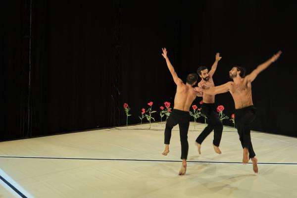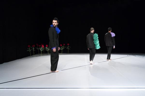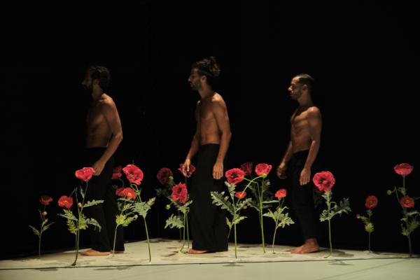 Ça ira commence dans l'ombre. La lumière monte doucement dévoilant trois hommes en costumes noirs marchant très lentement. Mais quelque chose cloche. Peut-être les frous-frous de tulle coloré qui tiennent lieu pour l'un de manche pour l'autre de col ou d'épaulette pour le troisième ; très seyant quoiqu'incongru…Ou bien cette scénographie triangulaire pointant ce micro isolé, à cour. Ou alors, en fond et haut de jardin, ce petit champ de coquelicots géants : pour tout spectateur féru, ce genre de champ de fleurs, même hors d'échelle, évoque nécessairement Nelken (1982). C'est comme ça : le champ de fleurs, c'est Pina Bausch comme le tulle renvoie au tutu – cygnes ou autres wilis – même violet ou bleu canard ; voilà bien des références pour un si petit espace ! Pendant ce temps, ils continuent à marcher même si c'est un peu plus vite, puis en désynchronisé, puis en changeant les orientations. Ce balancement rythmique des bras avec changements et les très subtiles variations rappellent fortement Anne Teresa de Keersmaeker dans sa période minimaliste et l'on se prend à vouloir décrypter chaque détail dans ces déplacements décidément très postmodernes. Mais un émule de la Judson – temple, s'il en fut, de la post-modern dance – aurait-il tourné ainsi sur lui-même, l'air hagard et vaguement ahuri ? Un postmoderne « n'ahurise » pas, c'est comme ça. Il y a donc quelque chose qui cloche.