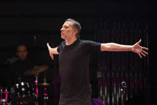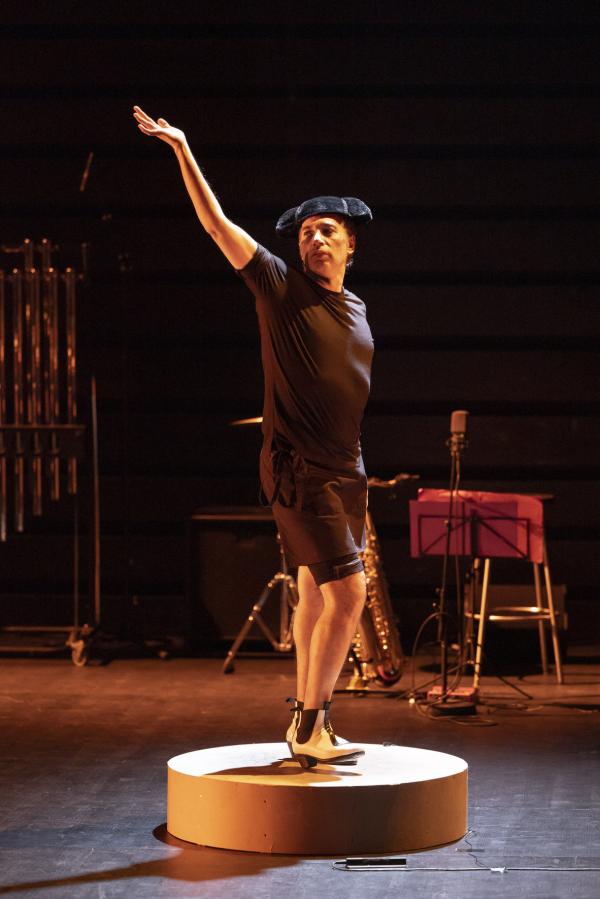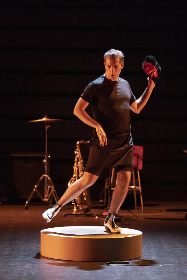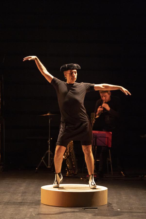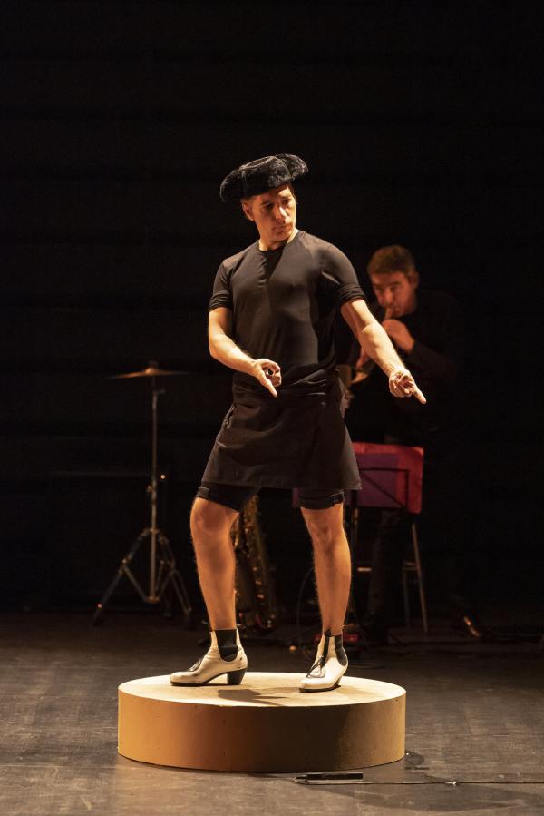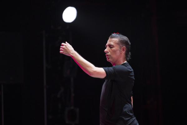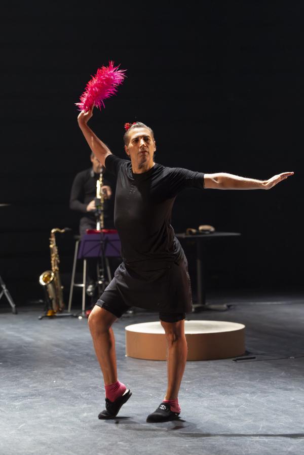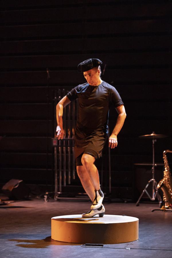 Sur la photo annonçant le show, affichée dans les couloirs du métropolitain, Israel Galván esquive un geste ambigu : s’agit-il du shoot d’un footballer sans ballon ou d’un coup de pied de l’âne sans façon et à tout hasard ? Cette dernière interprétation est d’autant plus vraisemblable que le bailaor entre en scène non (encore) chaussé de ses blanches bottines zébrées de noir mais de mules. Comme s’il était à la maison ou à l’hosto. Dans cette création visant à faire patienter les aficionados en attendant son retour sur la grande scène du Sarah Bernhardt restauré de frais (et, on imagine, à grands frais), il reprend les choses en main, si l’on peut dire, comme si de rien n’était. Ou presque. Il s’entoure de deux musiciens extrêmement talentueux, le batteur-percussionniste Antonio Moreno et le multi-instrumentiste Juan Jimenez Alba, saxophoniste et joueur, entre autres, de mirliton et de pipeau. Hors champ, opèrent ses fidèles ingénieurs du son, Pedro León et Félix Vázquez et son lumiériste Valentin Donaire. Intervient ici, par intermittence, la comédienne fluette et sans âge (entre les quinze et vingt-cinq ans, à vue d’œil) qui danse, chante, dit et lit sans pathos ni emphase des passages de La Métamorphose (1915) de Kafka et du Llanto por Ignacio Sánchez Mejías (1935) de Federico García Lorca.