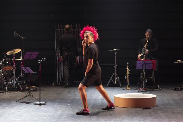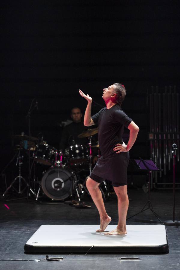 Le parcours du combattant n’est pas semé d’embûches mais d’agrès, de nouveaux supports, dancefloors ou templetes destinés à la danse. Ils sont ici réduits, en dimensions et en quantité, à un carré, à un cercle et à un cercle inscrit dans un carré. Faut-il rappeler que Galván ne s’entraîne pas à la barre dans des studios de danse mais dans des clubs de gym ? Sa suite gestuelle est exigeante, physiquement parlant. Pas seulement visuelle mais sonore. Il innove avec, cette fois, un plancher tout doux, matelas gonflable, trampoline lilliputien, qu’il parvient à faire sonner les pieds nus – qui contraste a priori avec les raclures amplifiées de souliers ferrés sur la chape métallique. Ce qu’il faut. Il innove avec la danse des mots de la fillette qui accompagne ou motive sa pure gesticulation. Il innove en dansant sur du free jazz, comme, jadis, le hoofer Baby Laurence. Au finale, comme il se doit, il énumère les artistes qui l’ont, depuis ses débuts, inspiré : Vicente Escudero, Enrique El Cojo, Mario Maya, Carmen Amaya…
