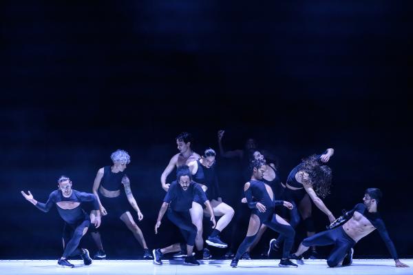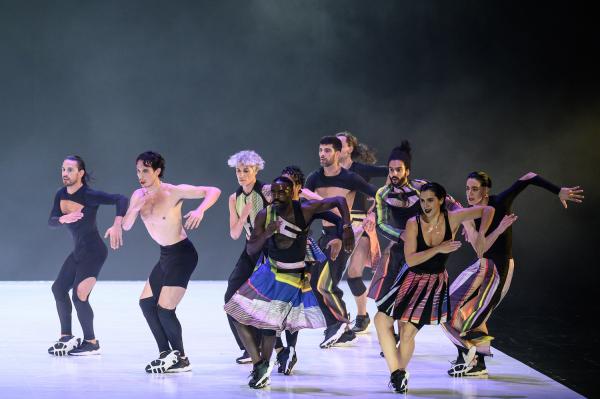 Deux musiciens encadrent la neuvaine de danseurs, l’un, João Pais Filipe (le batteur), côté jardin, l’autre, Luís Pestana (le DJ), côté cour. Eux aussi auront leur mot à dire. Ils font d’ailleurs leur entrée avant leurs collègues. La troupe est menée par l’une des trois danseuses, comme dans une parade. Les danseurs contournent l’obstacle, en l’espèce la grande piste de danse au ras du sol protégée de PVC virginal. Après avoir parcouru trois côtés du carré, ils osent affronter le public, et pénètrent sur le lieu sacré depuis le fond de la salle. Ils font incursion précautionneusement, sachant le programme qui les attend, qui n’est ni court ni libre. Le spectacle exige qu’ils fassent face, au risque de la perdre.