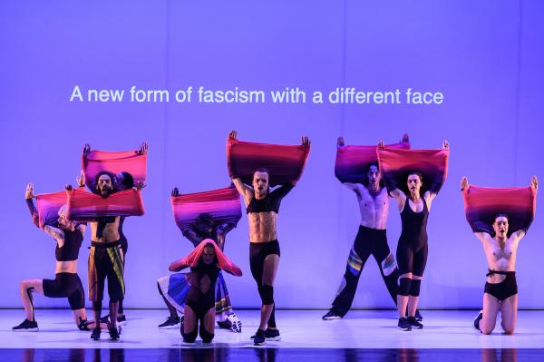 L’écran de séparation étant photosensible, il garde un court moment les traces des corps de danseurs fixés par la lumière électrique. De même, deux interprètes deviennent graffeurs en écrivant manuellement, sans encre, au moyen d’une torche électrique, le vœu que « tombent tous les murs ». Après les danses traditionnelles, avec force sautillements, les mains derrière le dos, tout finit par des chansons. La volte devient révolte. Sur le papier tout au moins. Les paroles des chants anti-bourgeois sont traduites en français et vidéoprojetés sur l’écran. Après les manifestations paysannes de ces derniers mois, le public ne pouvait qu’ovationner ces chants et ces danses agrestes. En partie aussi par leur dépense énergétique, les danseurs ont remporté un succès considérable.