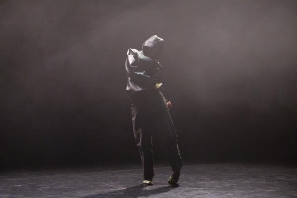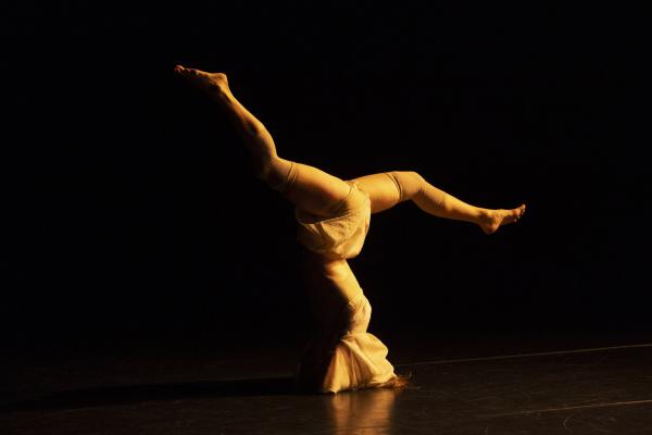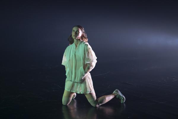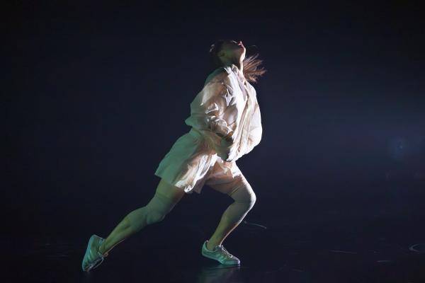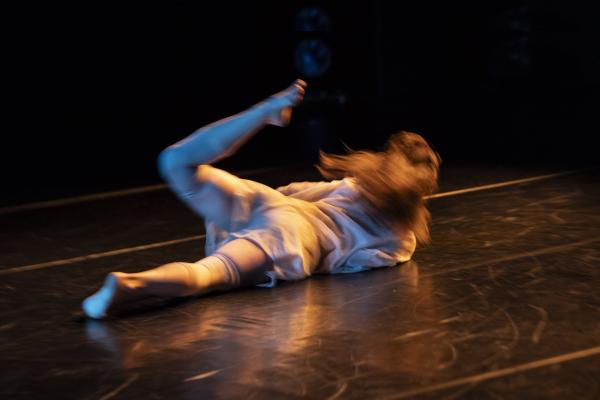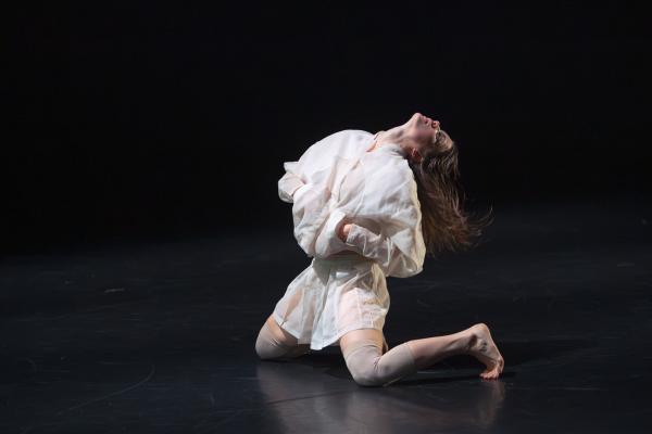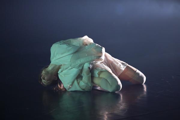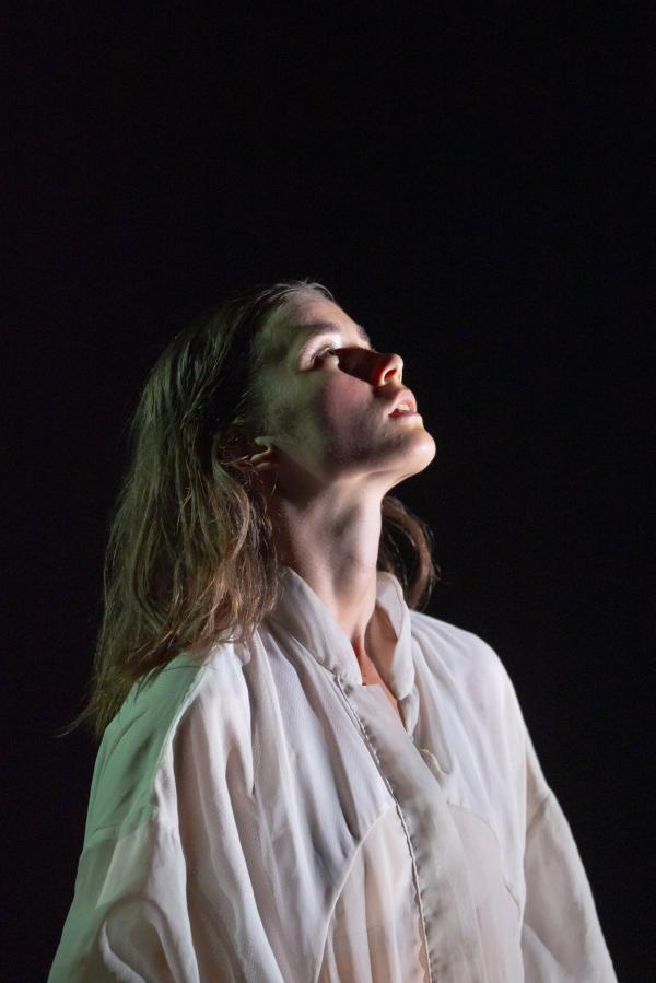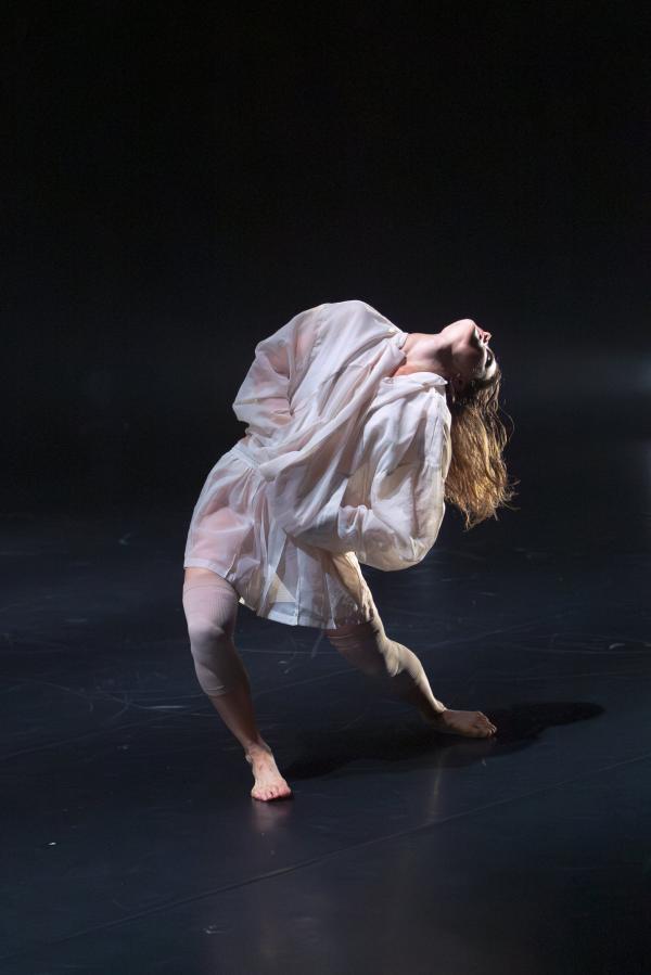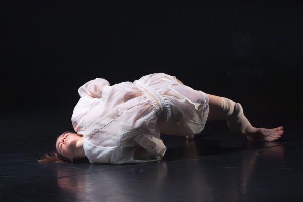 Tout commence par une reptation au sol, d’où se dégage une impression spectrale et presque hypnotique renforcée par les voiles qui habillent Dominyka Markevičiūtė. Elle entame un mouvement de torsion qui part uniquement du bassin, le corps comme scotché au tapis du plateau, qui fait penser à une noyée, ou une fille aperçue dans un rêve, avant que la nuit ne la baigne, ou dans une autre réalité. Les mouvements sont à la fois très liquides et désarticulés, comme une nage lente sous l’eau noire, qui finissent par former une spirale sans fin, comme les algues prennent la vague. Et il faut du temps, et que son buste remonte vers la surface avant de comprendre que ses bras sont entravés dans ses manches de mousseline et l’enchaînent et l’entraînent vers les profondeurs.