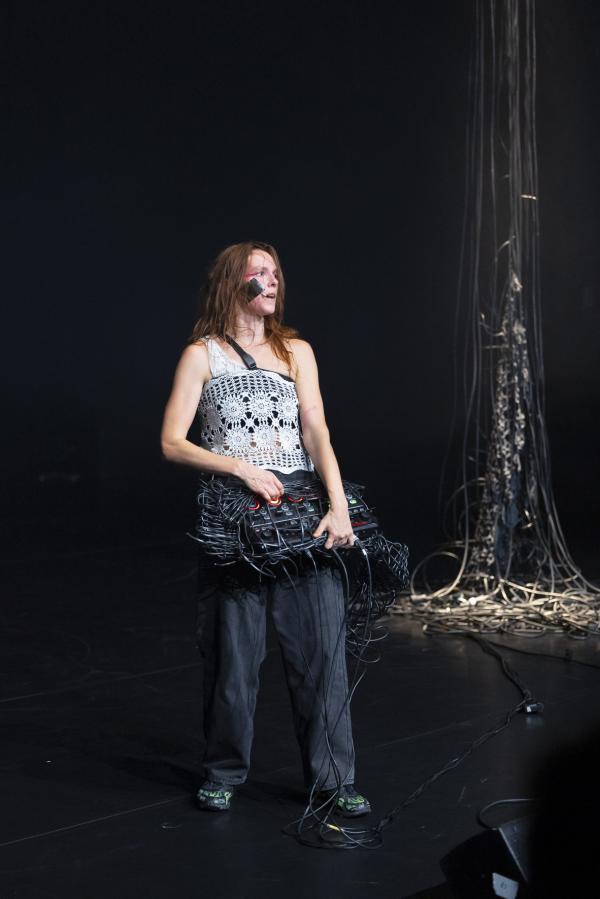 Son corps qui se cambre dans des sortes d’expansions et de contractions ont quelque chose d’explosif et de violent, comme ces cris qui ne profèrent aucune parole avant de se déchaîner dans un brouhaha qui indique le chaos physique et mental né d’une résistance acharnée. Les câbles qui délimitent l’espace ou pendent des cintres servent justement à boucler le son qu’elle génère elle-même à partir d’une machine faite pour cela, qui tord et distord, enroule et amplifie les mots et les bruits, tandis que sont projetés des images des grands rassemblements de Maïdan ou de Marioupol, ou des manifestations lituaniennes pour conserver leur indépendance arrachée à la Russie en 1991.