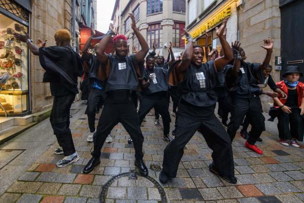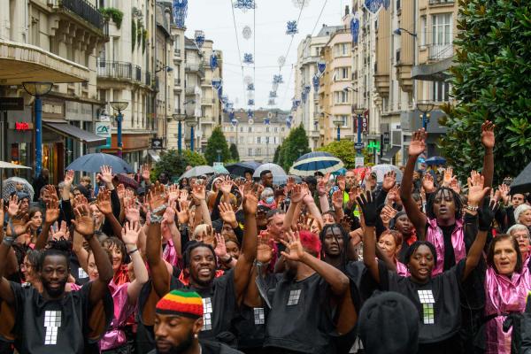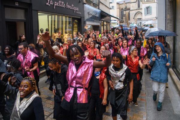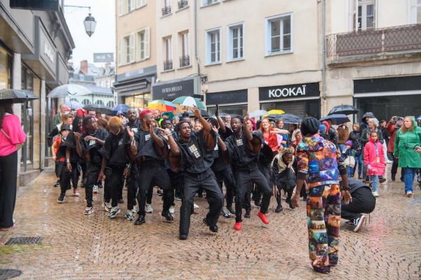 D’emblée était donné le ton. Les danseurs de Massidi Adiatou ont offert au public devant les Halles centrales de la ville une démo de danses urbaines revisitées, des sauts périlleux en veux-tu en voilà avec prise de risque insensée, une série impressionnante de roulades et de chutes sur le dos à même le pavé détrempé. Le public a suivi, accompagné et soutenu de la voix et du geste la manif protégée par un service d’ordre civil, restreint, veillant au grain.