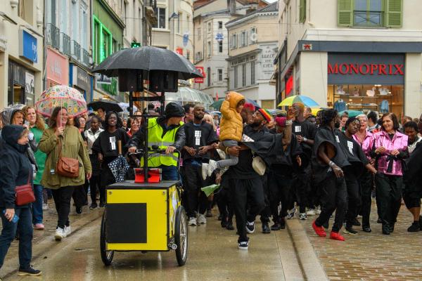 Avant de prendre la rue Princesse, les membres de N’Soleh et nombre de danseurs amateurs autochtones par eux affranchis auparavant, ont emprunté dans l’après-midi celles conduisant de la place de la Motte à celle de la République. Ce dans une joyeuse déambulation, tout d’abord au rythme du tambourinaire Élysé Song puis, par la suite, sur la musique électro d’un sound system fabriqué par les techniciens du festival embarqué sur un triporteur jaune citron conduit par un gilet jaune.