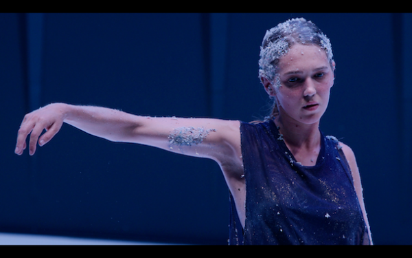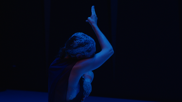 En haut de scène, une masse grisâtre, entre l'organique et le minéral ; cela pourrait s'apparenter à de la pouzzolane, roche volcanique assez légère — c'est de la ouate de cellulose grise — qui renvoie le corps en émergeant au registre de la terre. Une atmosphère étrange où se conjugue la puissance chthonienne, menaçante et sombre, avec la fragilité de la jeune fille, la koré… Car dès cette introduction — laquelle dure plus de cinq minutes cependant — quelque chose de dialectique se joue entre la rêverie de la profondeur et le dévoilement de soi. De la masse grise, le corps fin émerge comme la fille de Déméter qui revient chaque saison au jour échappant à Hadès.