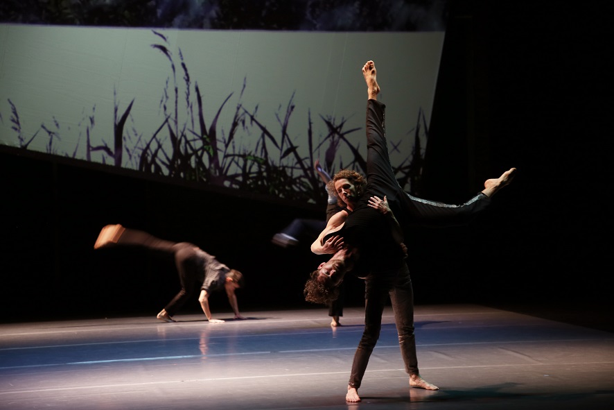 Au nombre de sept, ils semblent vivre un état originel, apparemment évoluant à leur gré. Leurs circonvolutions, leurs portés, leurs intenses dialogues avec la gravité semblent émerger spontanément. Ils forment un ensemble libre, sans former d'unissons. Leur jardin d'Eden chorégraphique n'est pas un jardin à la française, il est anglais, voire américain. Car ils défient les limites de la gravité, pour mieux trouver des états d'équilibre paradoxalement absolus – comme dans une pièce de Merce Cunningham, dans la même indépendance par rapport à la toile de fond et aux boucles électroniques (c'est le Veyrunes chorégraphe qui signe la musique), régulièrement troublée par une envolée lyrique avec la colorature de Wilhelmenia Wiggins Fernandez, empruntée au film Diva de Beineix. C'est là encore l'humain qui plante fièrement son égo dans un paysage donné, cette fois sonore.