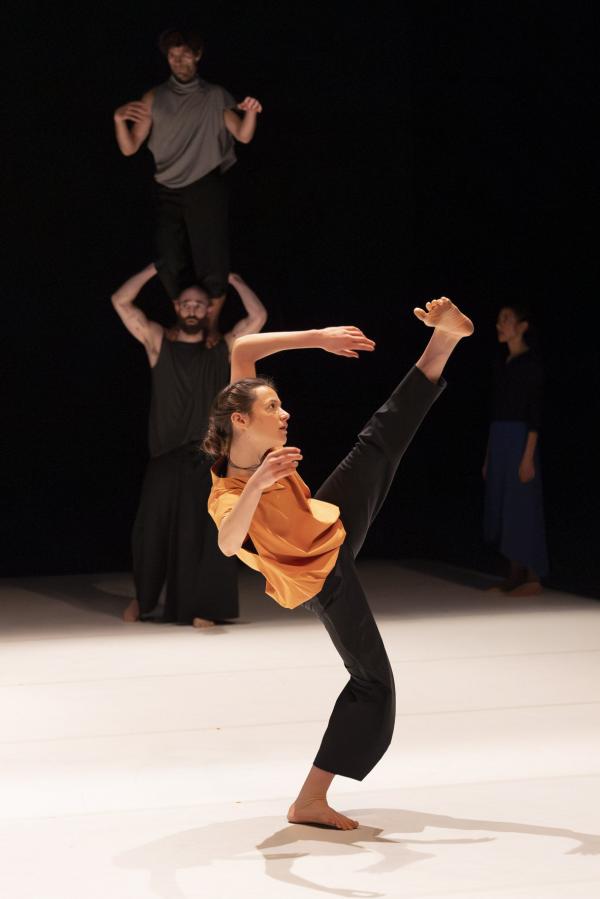 Les unissons désaccordés qui permettent au regard de zoomer soudain sur un individu, une figure, donnent à l’ensemble un aspect presque cinématographique avec un effet de profondeur de champ extrêmement réussi. L’écriture chorégraphique est extraordinairement travaillée dans la masse, avec ses déploiements et ses spirales, ses chutes finies quatrième, ses torsades sans fin, ses courbures magistrales, et ses voltes renversées. Le rythme est prenant, admirablement soutenu par la composition musicale de Patrick De Oliveira, tout en pulsations et en sonorités diverses et variées qui mêle voix profondes, et ondes électro, cordes et nappes subtiles. Tiraillés sans cesse entre poids des corps et élévation, énergie terrienne ou aérienne, les corps semblent toujours au bord du déséquilibre, de l’instabilité ou plutôt de l’intranquillité. C’est une fine partition d’états et d’humeur qui décuple le mouvement en autant d’expressions que d’interprètes.