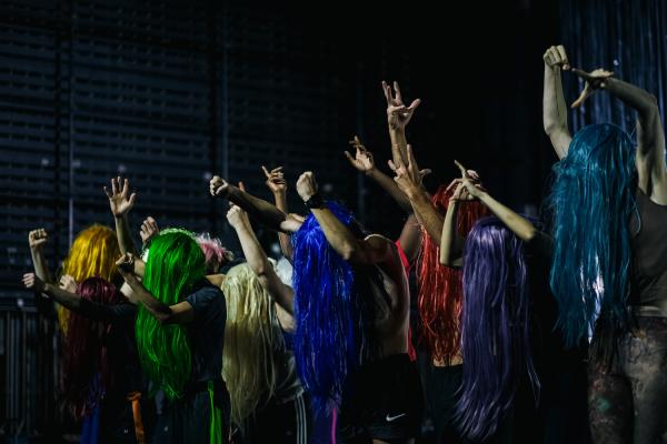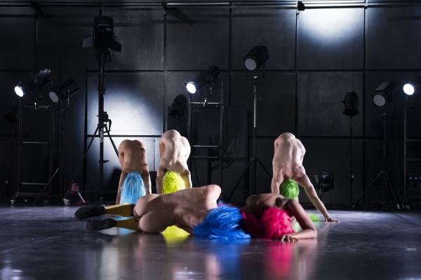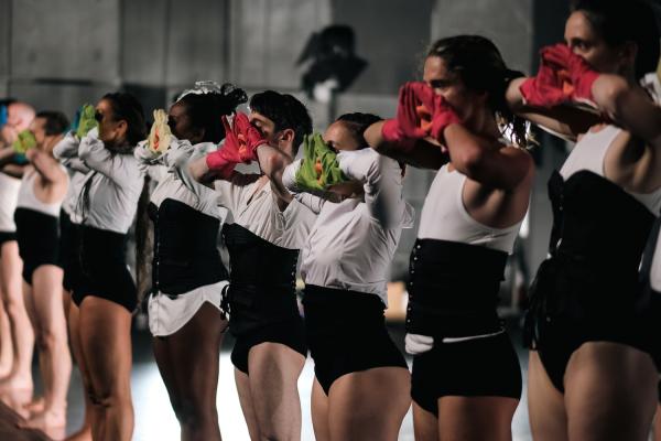 D'abord, une mise à nu des lionnes et lions de la soirée, au plus près du public. En off, la voix de Kae Tempest en chanté-parlé qui évoque dans sa chanson People’s Faces crise économique, pauvreté et oppression, mais aussi son inébranlable foi en l'humanité. Les quinze interprètes sont alors soumis à un ordre normatif qui prend la forme de duos ou trios réglés au cordeau et de combinaisons uniformes en noir et blanc, non sans évoquer les Beach Birds de Merce Cunningham. Mais déjà, le grotesque fait son entrée pour dynamiter la rigueur esthétique, quand les bouches sont contraintes, élargies et déformées, arborant un rose pétant. Contestation ou aliénation mentale ?