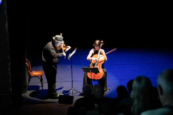 Colette Malye a choisi d’accompagner les duos et les solos de danse de morceaux composés par Alexander Balanescu joués par lui et la violoncelliste virtuose Caroline Sypienewski qui figurent pour la plupart dans l’album Maria T (2005) du Balanescu Quartet. Le violoniste a diffusé au finale une berceuse enregistrée par une chanteuse roumaine évoquant le solo Lullaby créé par Isadora Duncan en 1914 après la disparition de ses enfants. Les thèmes musicaux fusionnant avec finesse traditionnel d’Europe centrale et minimalisme américain. Ces thèmes rythment le spectacle, structurent la pièce une heure durant, donnent grain à moudre aux danseuses.