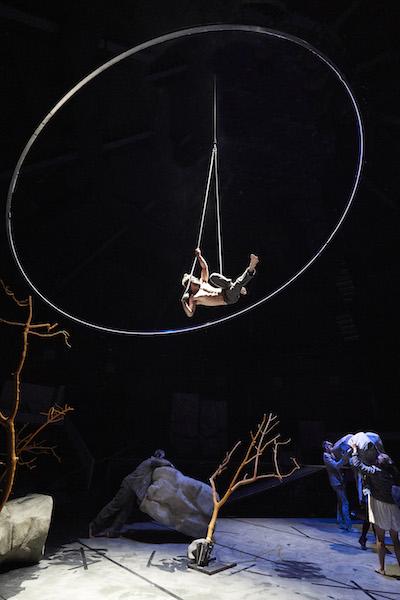 Arbres desséchés, ombres végétales, amas de roches, parsèment la piste du chapiteau historique, un large anneau sidéral plane à son sommet. C’est dans ce paysage sublimé de fin du monde, probablement inspiré de l’évènement de la Toungouska, l’une des plus importante collision d’un corps céleste avec la Terre, survenue en 1908, et qui impacta la ville sibérienne de Vanavara… que les 15 élèves de la 28ème promotion du CNAC, vont clore leurs années d’étude dans un spectacle mis en piste par Gaêtan Lévêque, Marlène Rubellini-Giordano et Chloé Duvauchel, trois anciens du CNAC et fondateurs du Collectif pluridisciplinaire AOC.