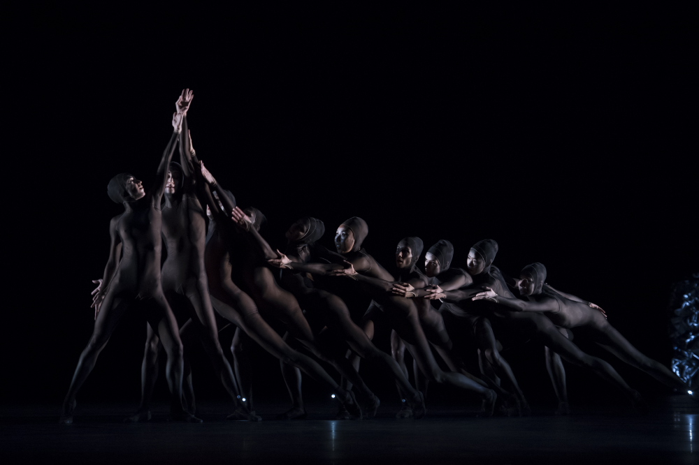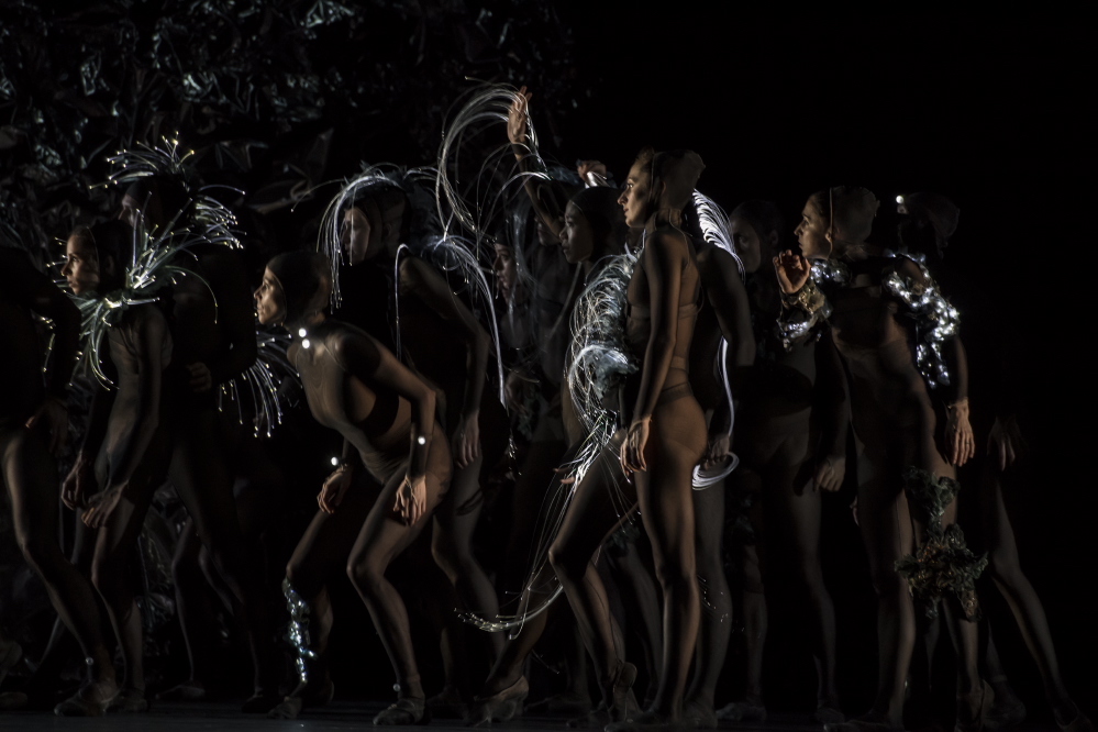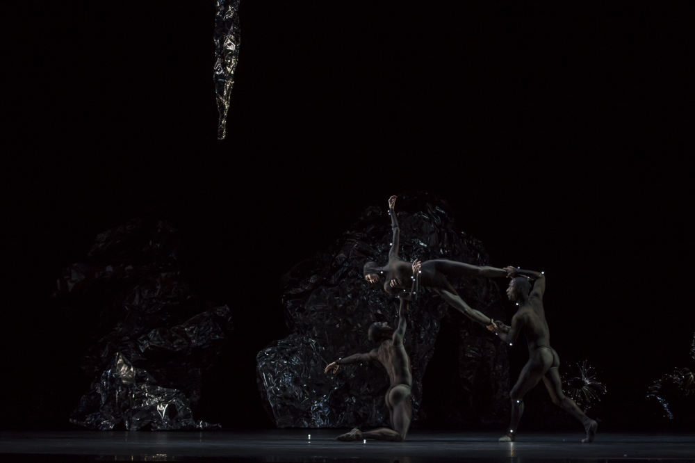 De fulgurances en recueillements, une horde asexuée s’adonne à un rite nocturne, face à des rochers brillants et probablement sacrés. La scène est surplombée par une statue de déesse-ballerine, toute aussi argentée que la porte des ténèbres. Et Maillot continue d’épurer: Les costumes, d’intrigants juste-au-corps, semblent jouer avec la transparence mais produisent paradoxalement une absence de tout enjeu de séduction.