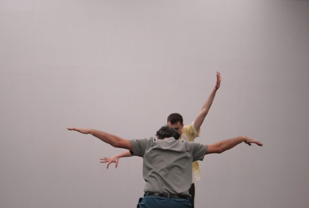 Tout commence par l’amour de Jules pour son groupe favori AC/DC (un groupe hard rock des années 70) qu’il porte comme un étendard sur des T-Shirts qu’il enlève successivement, révélant, à chaque fois, des graphismes différents comme autant de concerts traversés. À la fois drôle et bien mené, Jules Lebel commence à déployer son univers, en des poses espiègles à chaque fois qu’il dévoile un autre vêtement ! Mais bientôt, les travaux d’approche entre les deux interprètes débutent. Et il s’agit bien de travaux, puisque les deux vont s’atteler à construire une sorte de cabane délicate avec quelques bouts de bambou – ou de roseaux dansants – et d’approche, car ils semblent se flairer l’un l’autre avant de pouvoir vraiment se toucher et s’attraper. Ce qui frappe, c’est la délicatesse des gestes de l’un envers l’autre, cherchant, en quelque sorte, à apprivoiser l’autre corps, à l’aborder sans le brusquer. Mais le plus intéressant reste ces deux gestuelles qui s’entrelacent.
