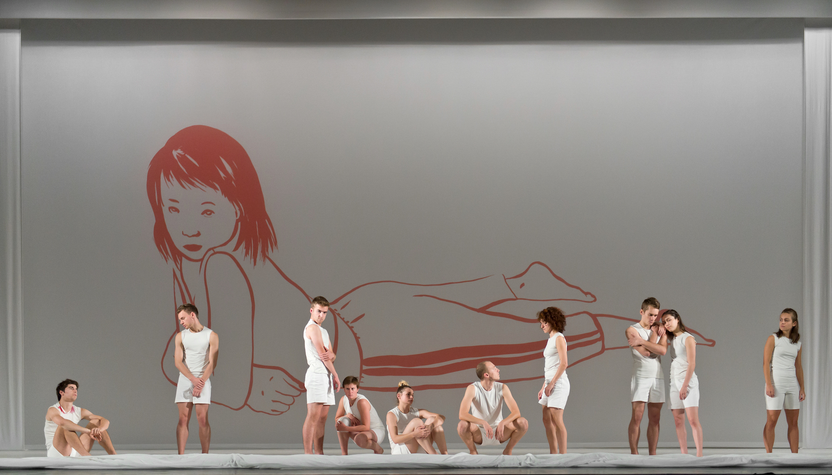 Un grand rideau blanc cache le plateau. D’un coup, il s’écroule au sol avec une délicieuse légèreté. Sur scène, dix jeunes danseurs tous vêtus à l’identique de shorts et tee-shirts blancs. Au fond, le dessin d’un ou d’une jeune allongé(e) sur le ventre. Les cinq filles et les cinq garçons débutent avec une danse où seul le haut du corps est véritablement mouvant. On ressent dans les grands gestes des bras une envie de s’exprimer, mais justement, ils hésitent entre le coté latent et une certaine mollesse liés au mal être dû à l’âge. Des petits instants de nervosité apparaissent et là, le mouvement se délie, puis fini par revenir au point de départ.