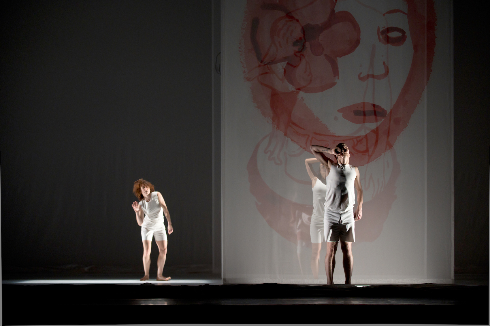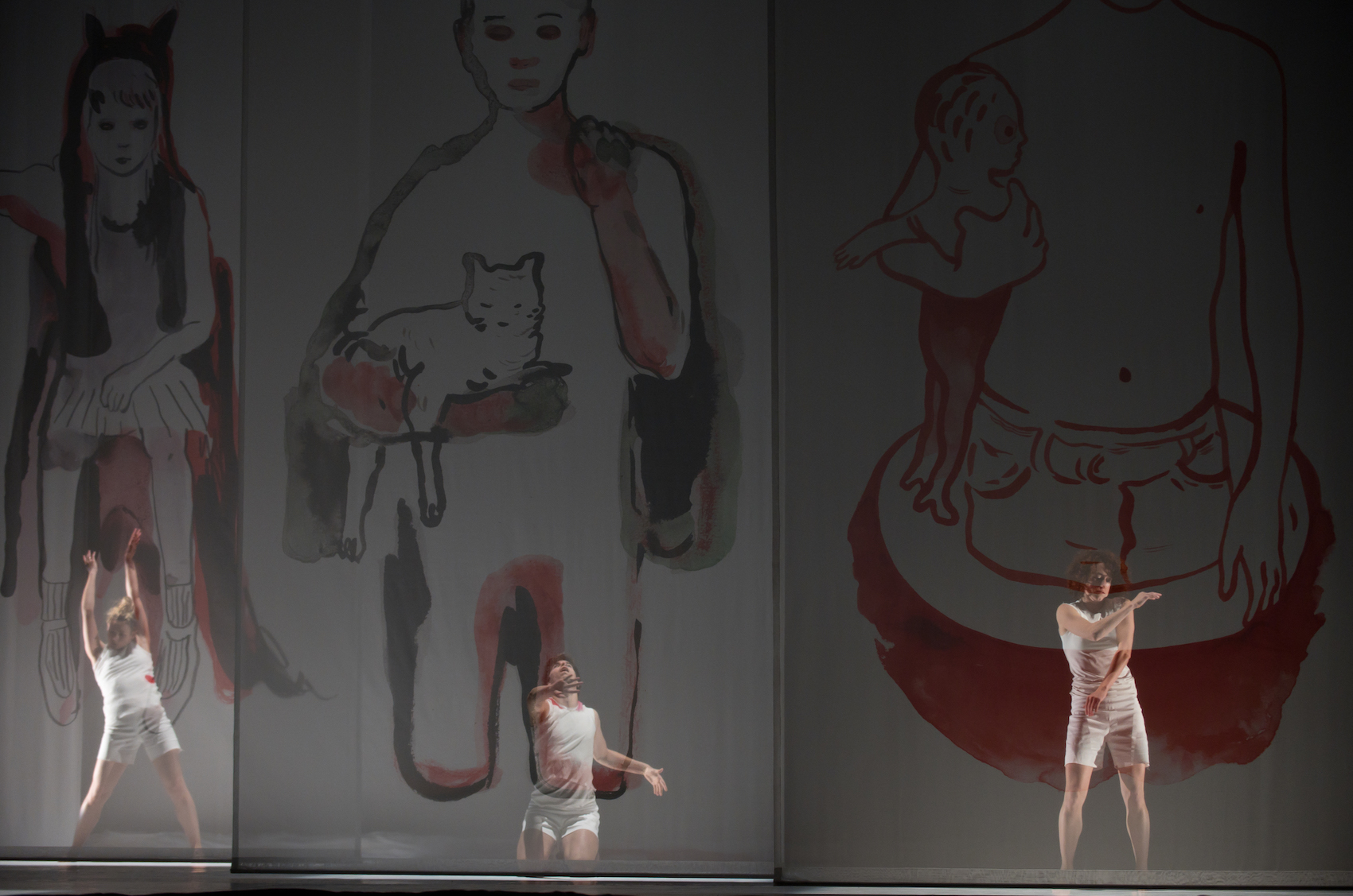 Puis le cyclo s’effondre tout aussi délicatement et d’autres voiles apparaissent poussés ou tirés par les danseurs dont les tee-shirts présentent chacun une tâche rouge différente. Les dessins complètent les intentions : une allusion à Peau d’âne, un jeune garçon avec une poupée, un visage rouge dont l’œil est caché par une fleur.