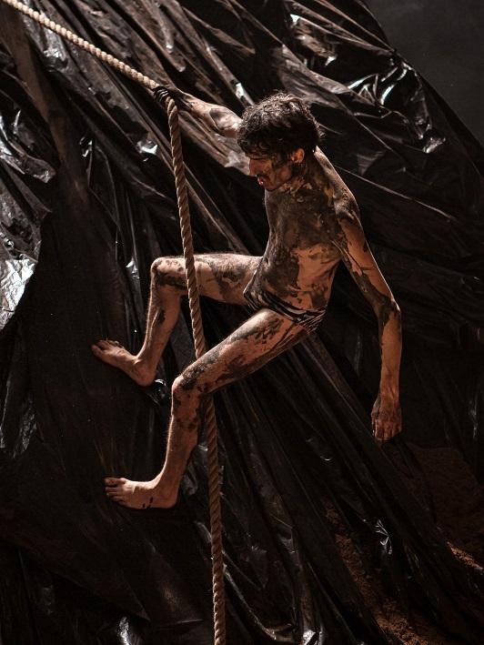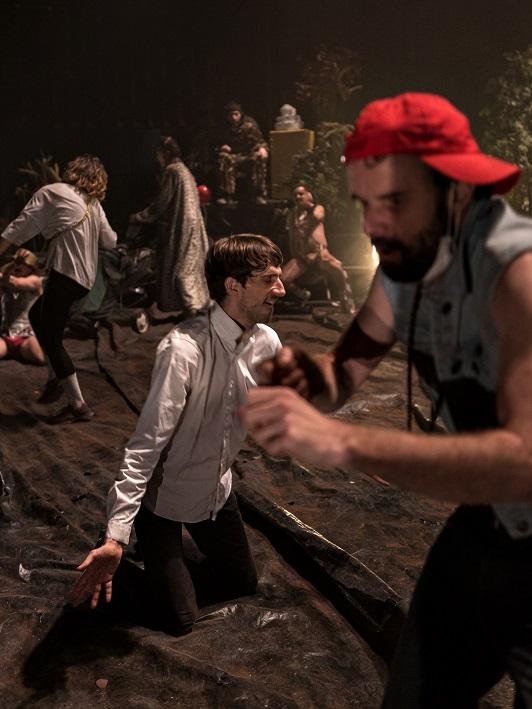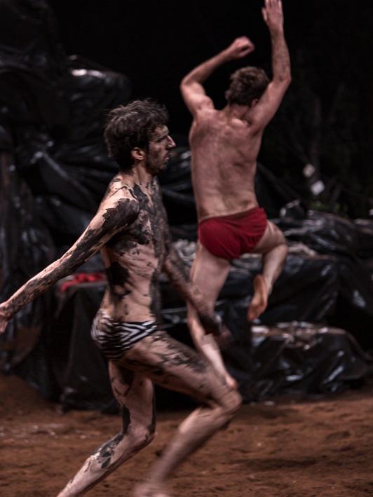 Le vieux monde ayant succombé, il va donc falloir se réinventer. Le déluge de sable et de débris sera enroulé dans une énorme bâche noire, laissant apparaître un terrain vierge, un terreau profond et potentiellement fertile. Aussitôt, des êtres nouveaux font apparition. En effet, après l’opération table rase et l’effondrement, le retour à la nature paraît sans alternative. Trois scénarios sont proposés, histoire d’avancer... en direction du passé. D’abord, une sorte de vie sauvage avec ses faunes (dans le sens de Nijinski) et leurs cris de bêtes façon Planète des singes. Ensuite, une expérience de vie dans l’esprit des 70’s où l’on chante la liberté sexuelle et la découverte de soi, animation pour la salle incluse. Après quelques exercices de respiration, un talk show fait revivre les idées d’un retour à une vie en harmonie avec la nature, dernière lubie chez les urbains qui rêvent de tout quitter et de créer, entre autres, une « ferme participative ».